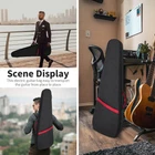 Made of durable scratch resistant fabric, with sturdy double zipper, anti-slip rubber pad on the bottom to prevent abrasion to the fabric. Soft padded gig bag for guitars, great to keep the dust, water and dirt off your guitar. Unique triangle curve shape and red band design adding character to the dull black guitar gig bag. Fits for 39 inch Guitars. Lightweight guitar backpack has a neck holding strap to keep the guitar in place. Thick padding shell is good protection to keep the musical instrument from light-travel nicks, scuffs and scratches. Side grip handle, back hanger loop and dual adjustable padded shoulder straps, provide multiple convenient ways to get the guitar from place to place. As guitar carrying case or guitar backpack to transport your guitar back and forth to gigs, travel, home, church, lessons, gigs, concert, music school, rehearsals, studio, club, musical instrument . Large zippered pouch under red stripe can hold guitar picks, cables, strings, music book, notebook, , sheet music, guitar straps, tuners, capos and other musical accessories. Portable guitar bag is a perfect gift for guitar beginner, students, guitarist. Such as birthday gifts, back to school gifts, party gifts, surprise gifts. TIPS: THIS GIG BAG CAN'T HOLD BASS GUITAR.