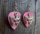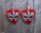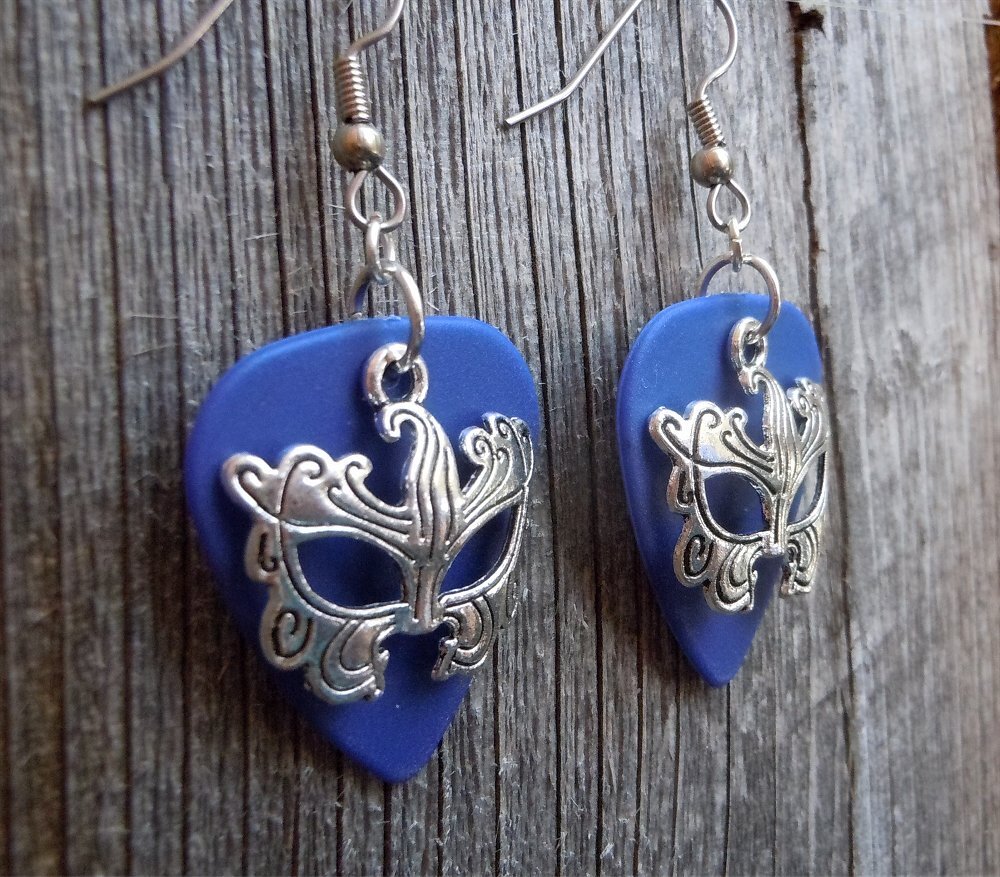 These are made with real guitar picks. That means that the back of the guitar picks may have the emblem of the guitar pick company printed on it. I also used silver toned fancy eye mask charms. PLEASE NOTE: These are available in many guitar pick colors and patterns. They are all listed in the drop down menu. They are 2.25 inches long from the top of of the ear wire curve to the very bottom of the whole earring, and they have surgical steel earwires (nickel free, hypoallergenic). To get an idea of how long the earrings will be on you, start from where your ear is pierced and measure down. All of my jewelry and accessories are handmade by me. Made in and shipped from Lubbock, TX. USA Flat Rate Shipping. You pay for shipping on the first item, all additional items have no additional shipping fees.