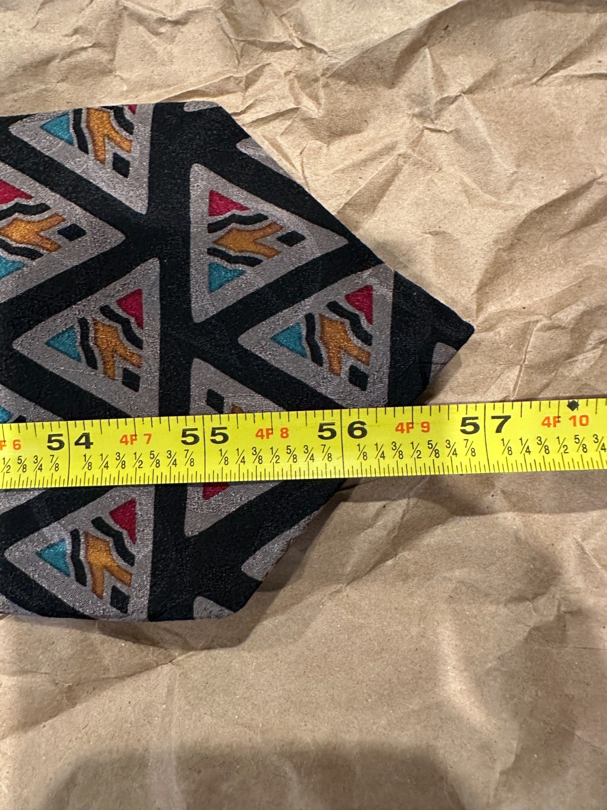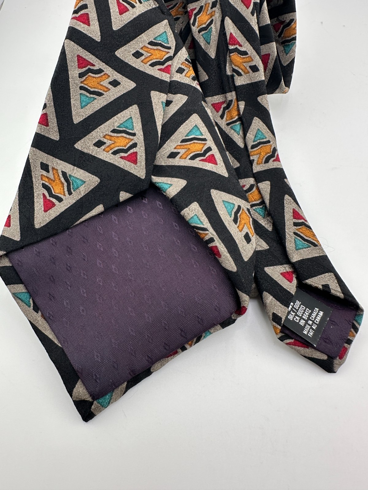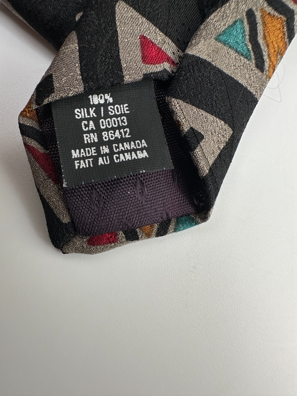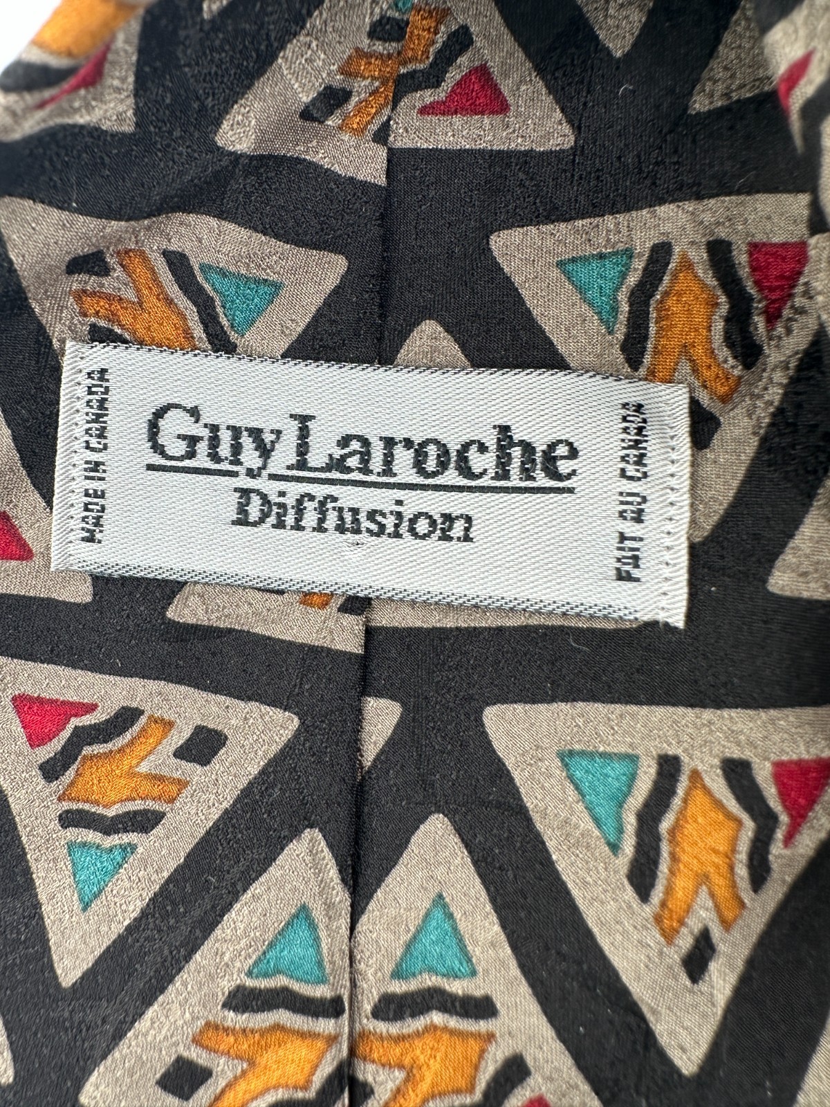 Vintage Guy Laroche silk necktie featuring bold geometric triangle pattern. Made in Canada. Unique designer style in excellent condition.