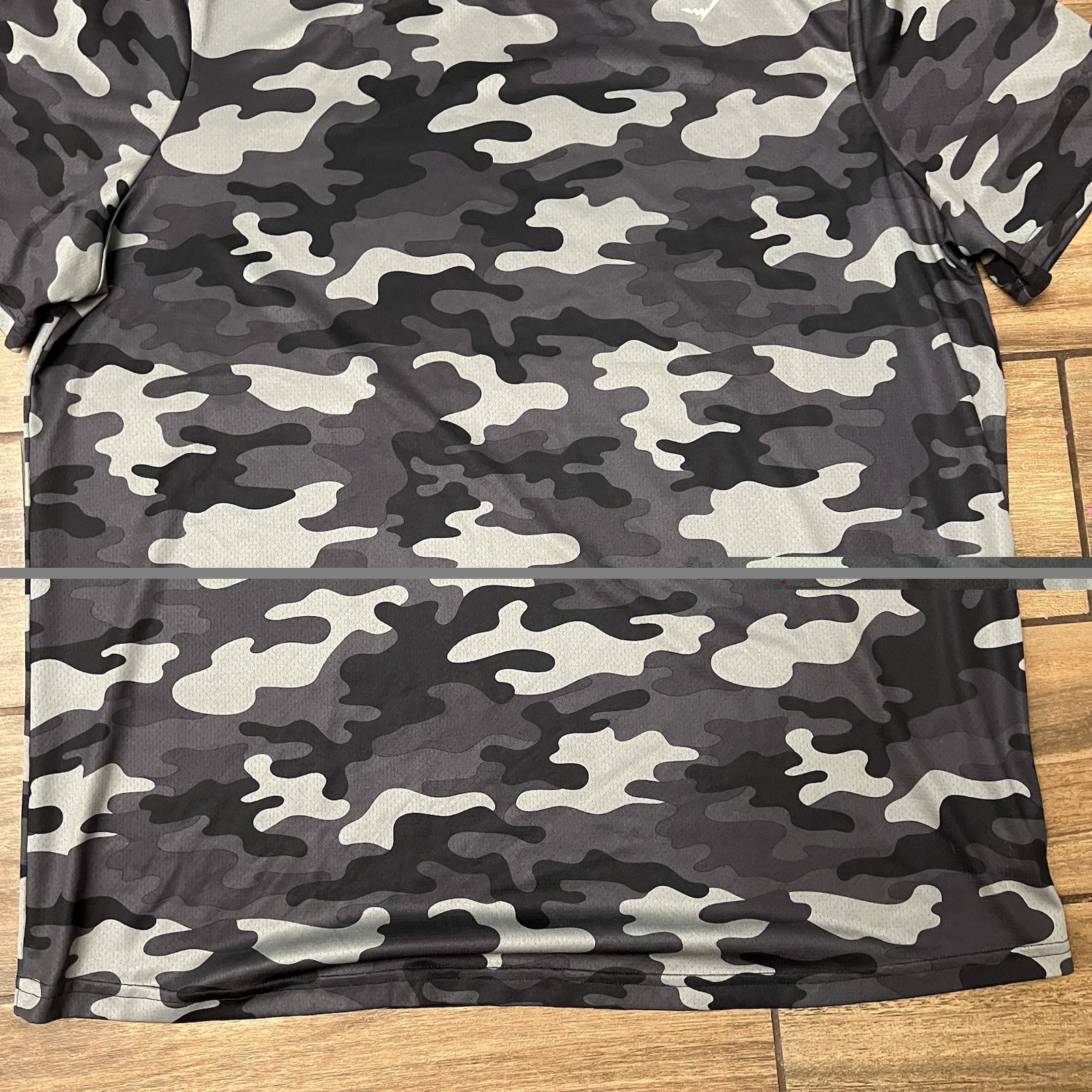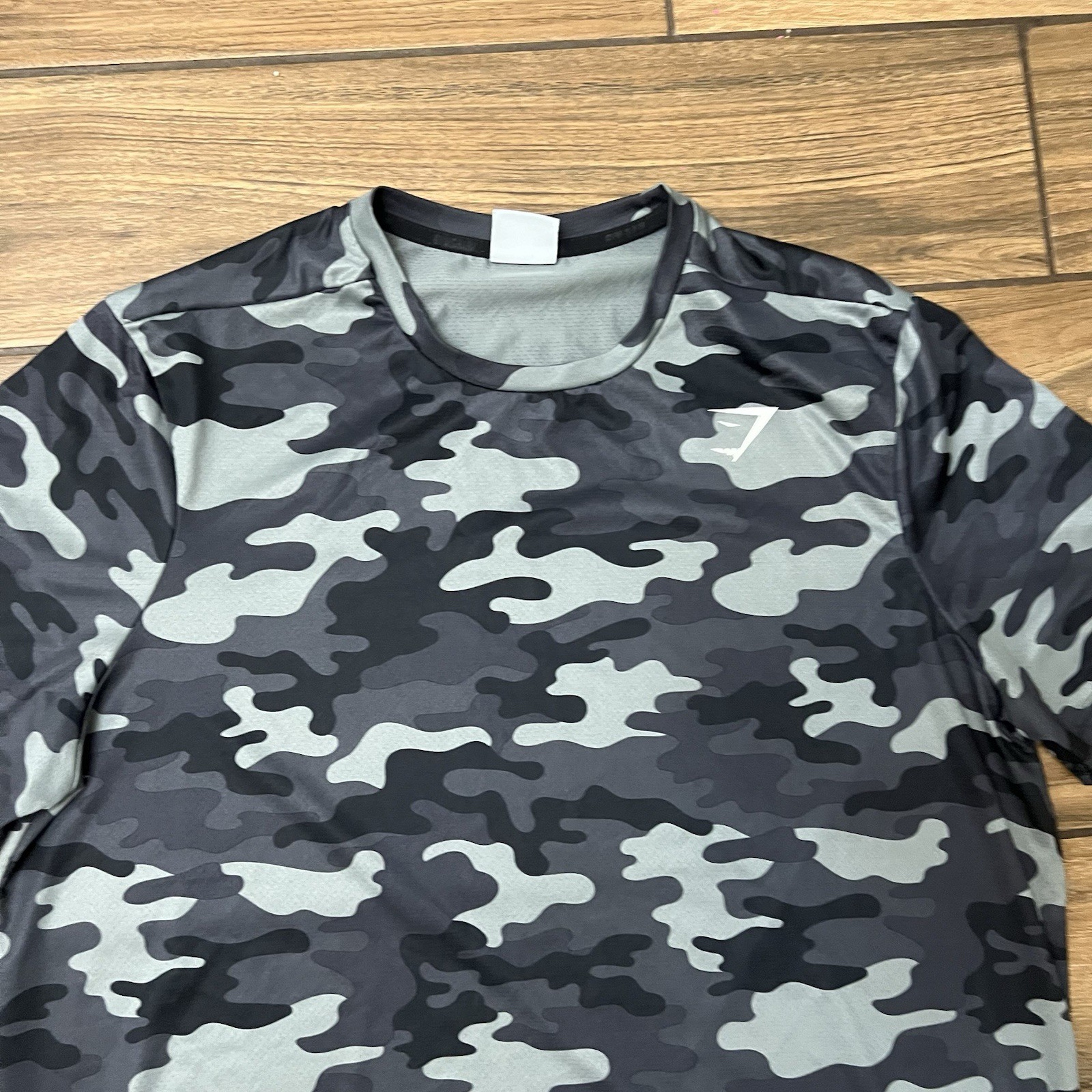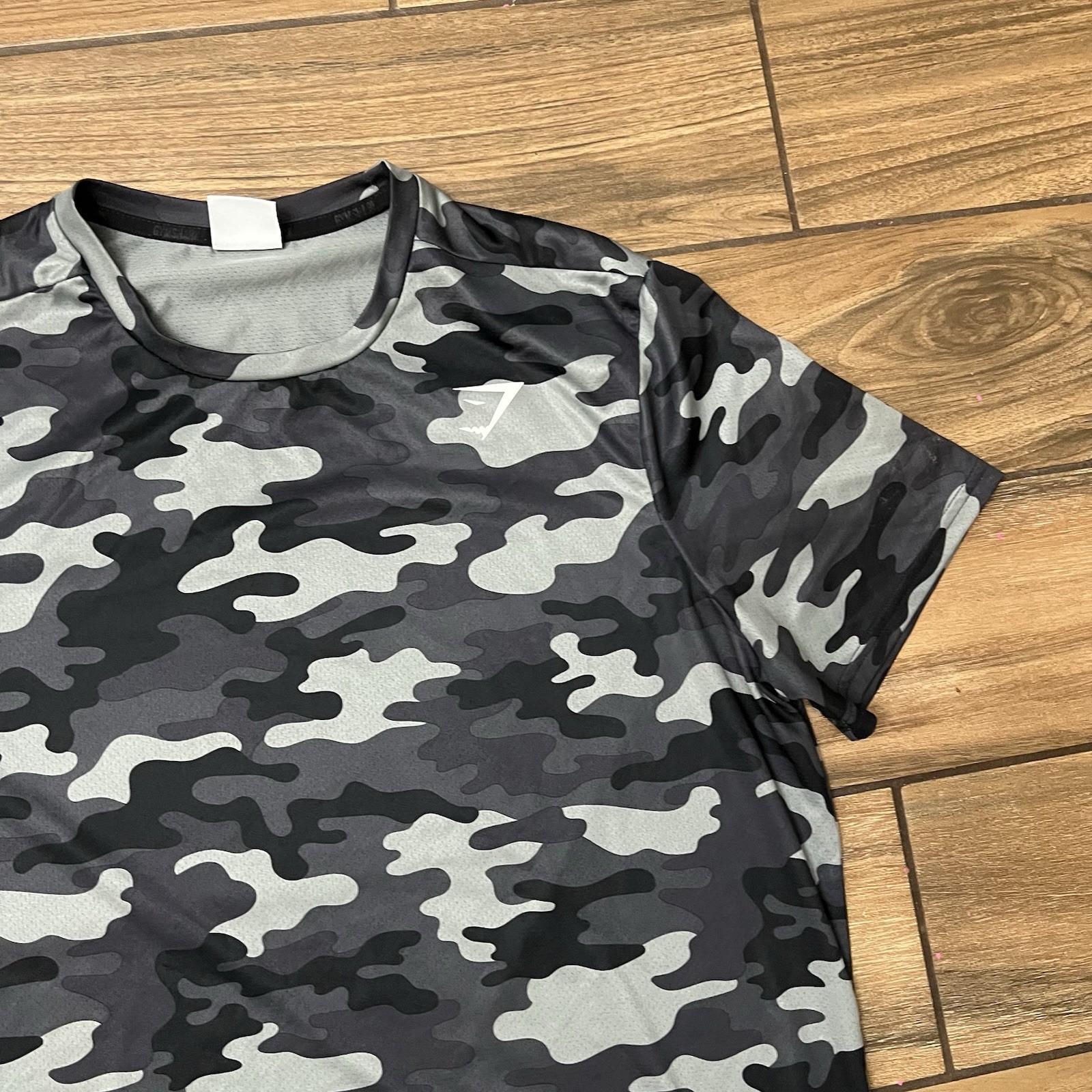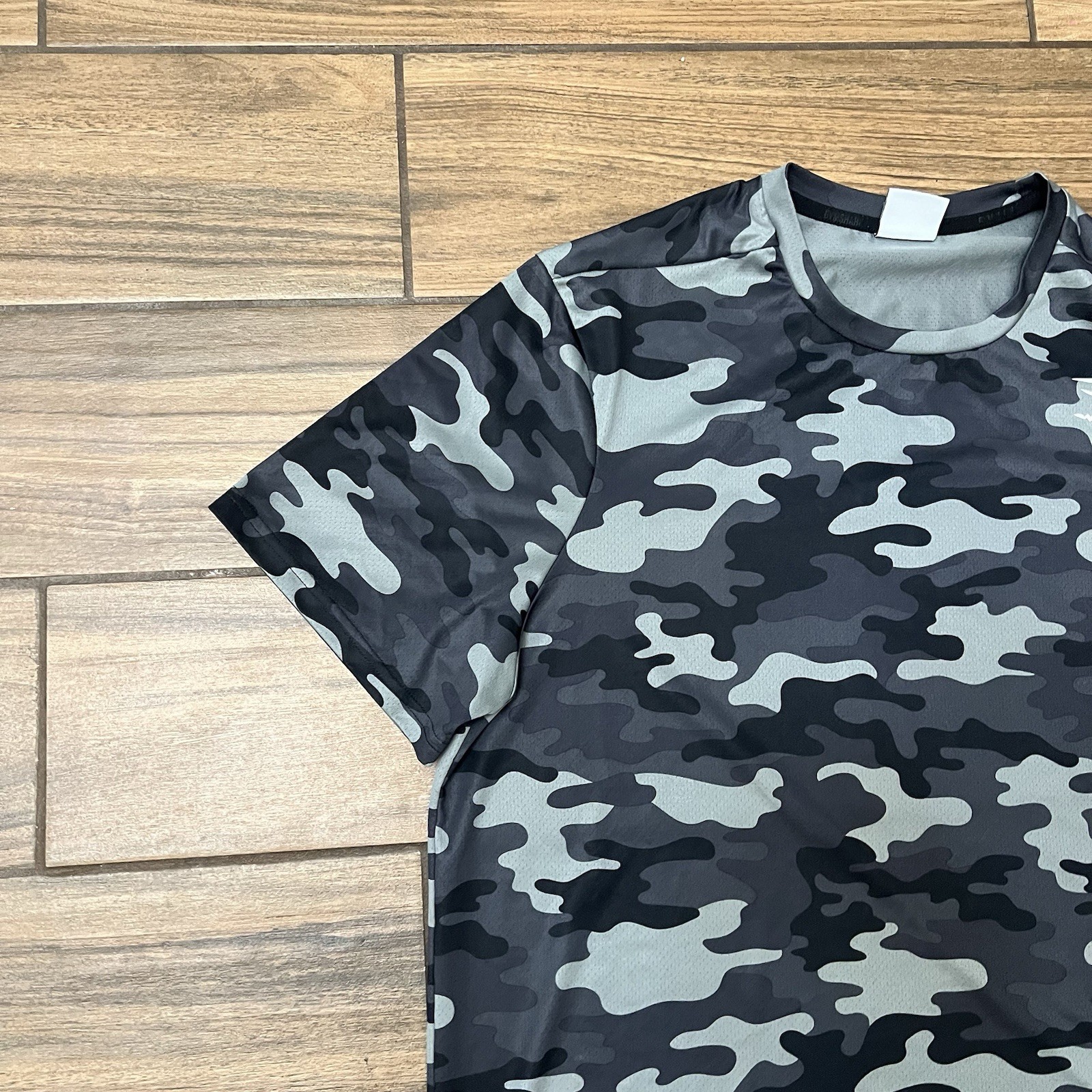 The Gymshark Men's Camo Athletic T-Shirt in size XL is a high-performance activewear top perfect for the modern man. Made with a comfortable and breathable material, the tee features a stylish camouflage pattern in black, making it ideal for both workout and casual occasions. The athletic fit provides added support and comfort during physical activities, while the regular size type ensures a comfortable fit for everyday wear. Whether you're hitting the gym or just lounging in style, this Gymshark tee is a versatile and stylish addition to your wardrobe.
