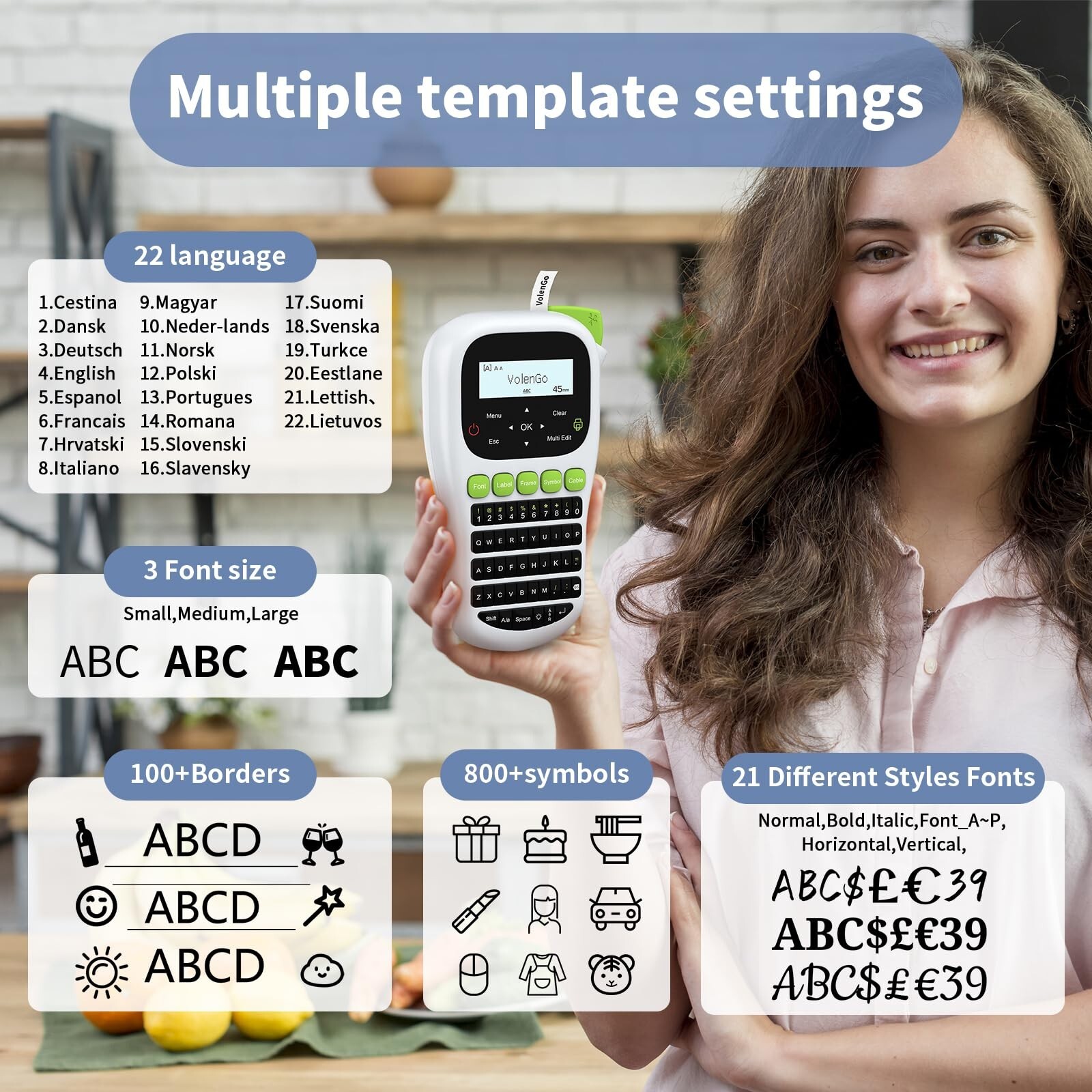 H1100 Label Maker Machine with Tapes 12mm Laminated, Handheld Label Maker Waterproof-Labels, Portable Backlit Labeler Multi Fonts, Inkless Wire Label Printer for Home Office Organization Product Details Color: Green Brand: VolenGo MPN: H1100-WG EAN: 6942287248437 UPC: Does not apply Brand: VolenGo Connectivity Technology: USB Printing Technology: QWERTY Keyboard Special Feature: Portable Color: Green Model Name: H1100 Label Maker with Tape Printer Output: Monochrome Maximum Print Speed (Color): 10.0 Max Printspeed Monochrome: 10 ppm Item Weight: 400 Grams Product Dimensions: 2.64"D x 4.92"W x 8.66"H Controller Type: Push Button Printer Media Size Maximum: 0.47inch Included Components: 1 x H1100 label maker machine, 1 x Replacement cutling holder, 1 x USB Type-C cable, 1 x Laminated white tape 12mm(1/2in)x 4m, 1 x Instruction manual Print media: Labels Scanner Type: Portable Max Input Sheet Capacity: 12 Max Copy Speed (Black & White): 1E+1 ppm Display Type: Backlight LCD Sheet Size: 3.5, 6, 9, 12 Millimeters Maximum Black and White Print Resolution: 203 DPI Warranty Type: limited warranty Dual-sided printing: No Max copy resolution black-white: 203 Duplex: Simplex Hardware Interface: USB Type C Ink Color: black Resolution: 203 x 203 DPI Additional Printer functions: Print Only Control Method: Touch Processor Count: 1 Series Number: 1100 Total USB Ports: 1 Model Series: 1100 Specific Uses For Product: home kitchen organization, kids school stuff, office organization Item Weight: 14.1 ounces Item model number: H1100-WG Date First Available: March 28, 2024 Manufacturer: VolenGo Easy-to-Use: VolenGo H1100 label maker machine features easy setup, user-friendly menus, and intuitive settings; H1100 handheld label maker has a lightweight design and a user-friendly interface Backlight Screen: VolenGo H1100 Labeling machine has a clear LCD screen, even in low-light situations; No more struggling to see what you're doing, our 203 DPI labeler makes it a breeze Three Cable Modes: Efficient wire label maker with three cable modes; Ideal for quick and easy cable management Durability and Clarity: Label makers with black on white laminated tape; Enhanced version features chip encryption for clearer printing; Withstand scratching, oil, water and extreme temperatures without fading Lightweight and QWERTY Keyboard: Effortlessly type text for organization with QWERTY keyboard; H1100 labeling maker is lightweight, weighing just 1 lb; Convenient and portable, making organizing on the go effortless Two Power Modes: H1100 handheld label printer powered by 6 AAA dry cells (not included) or via USB C cable (included); Print 263 ft (80 m) of label tapes with 6 full-power dry cells