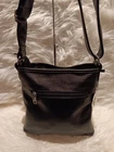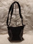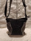 Tiny crystals and studded stones add shimmering glamour to a practical crossbody sling. Has back zipper pocket adjustable strap with a 22 inch drop length made of faux leather construction fully lined interior, two interior slip pockets and one zipper pocket top zipper closure silver hardware. Approximate size 10.5Lx10.5Hx1.5W