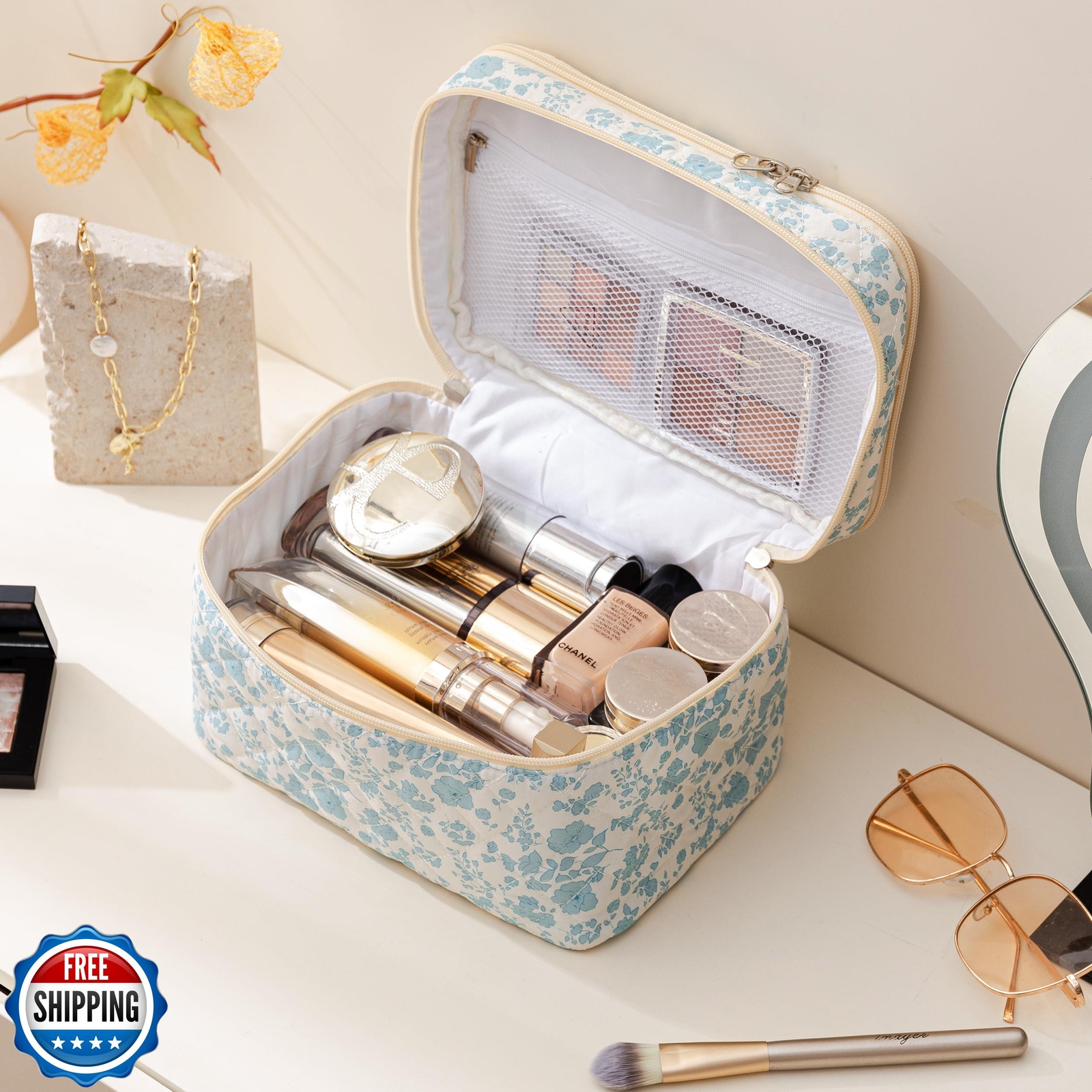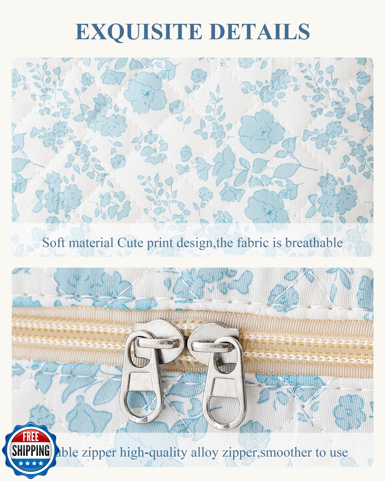 HBselect Quilted Makeup Bag, Portable Cotton Large Travel Makeup Bag, Cute Coquette Blueflowers Floral Cosmetic Bags Toiletry Bags for Women Teen Girls Mom Features SOFT COTTON MATERIAL - The quilted cotton makeup bag is made of high-quality cotton, reliable and stable, which is lightweight and good in texture, soft and durable. The zipper is smooth to use, which looks pretty, and opens, and closes the makeup travel bag smoothly and easily. LARGE CAPACITY - Makeup bag Size: 10.1 x 5.9 x 5.3 inches, Portable and large capacity. The travel makeup bag can hold your lipstick, cosmetic accessories, lipstick, lip gloss, brushes, skincare products, toiletries, 3c items, stationery kit, watercolor pens pencils, painting brushes, makeup tools, toiletries, or travel essentials and can be easily folded up and placed in a handbag or suitcase when not in use QUILTED DESIGN - This cute floral cosmetic bag features a floral pattern design, is fashionable and skin-friendly, and is comfortable to the touch. The stylish design makes these makeup bags a fashionable accessory, suitable for both your everyday makeup routine and special occasions, allowing you to showcase your personal style MULTI-PURPOSE - HBselect Makeup bag organizer can be used as a daily handbag, cosmetic bag and skincare organizing bag, storage bag, pencil pouch, and toiletry bag. The initial makeup storage bag can be used during travel because it is lightweight and does not take up too much space in the suitcase. PERSONALIZED GIFTS FOR WOMEN - Our makeup bags are cute and individualized and are great gifts for women, such as mothers, wives, daughters, sisters, teachers, and friends. Makeup Bags for women could be the perfect personalized gifts for Birthday Gifts, Mother's Day Gifts, Christmas Gifts, Valentine's Day Gifts, Graduation Gifts, Teachers' Day Gifts, and more. Our Makeup pouch is for women of all ages. Bring back amazing memories when she uses it every time Shipping Free & Fast Shipping: We offer free shipping to most of the USA with a normal delivery time of 3-7 days. However, due to the current situation, additional delivery time (up to 3 weeks) may be required for some items. Alternative Carriers: We may use alternative carriers (e.g., USPS, FedEx, UPS) to ensure your package arrives safely and on time. Due to the use of multiple carriers, we are unable to provide a tracking number automatically. Handling Time: Orders are processed and shipped within 1-2 business days of receiving cleared payment. Shipping Restrictions: Shipping to Alaska, Hawaii, Puerto Rico, Guam, and other US territories may incur shipping charges or delivery restrictions. Please contact us before ordering, or your order can be refunded/cancelled. State Restrictions: Certain items may not be shipped to California due to state regulations. Contact for Tracking Updates: If you require tracking updates or have any concerns about the delivery of your order, please feel free to contact us, and we will be happy to assist you. Return Policy 30-Day Hassle-Free Returns: If you are not completely satisfied with your purchase, you can return the item for free within 30 days of receiving it for a full refund or exchange. Easy Return Process: Contact us, and we will provide you with a prepaid return shipping label and detailed instructions. No Restocking Fee: There are no restocking fees for returns. However, the buyer is responsible for return shipping costs if the return is not due to a seller"s error. Refund Processing: Refunds will be processed within 1 business day of receiving the returned item in its original condition. Feedback Your feedback is extremely important to us. We strive to provide the best products and customer service possible. If you are satisfied with your purchase, please take a moment to leave us a positive review. If you have any concerns or issues with your order, please contact us before leaving negative feedback. We are committed to resolving any problems and ensuring your satisfaction. Contact Us If you have any questions or concerns, please feel free to reach out to our customer support team. You can contact us through the eBay messaging system. We are available Monday to Friday, 9:00 am to 5:00 pm EST, and we will do our best to respond to your inquiry within 24 hours. Thank you for supporting our small family business!
