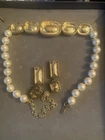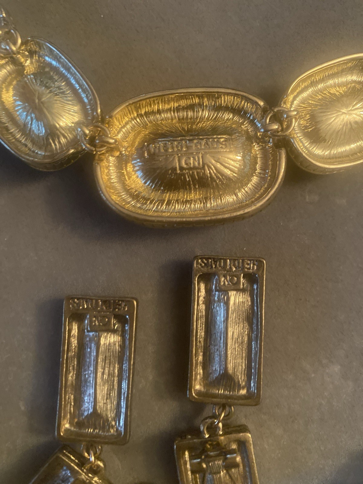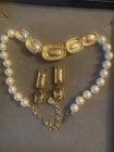 Perfectly elegant emerald shape emerald colored glass stones, cream color simulated Pearl glass beads,, 163/4β , 3β extender, STATION NECKLACE matching signed articulated 2β drop earrings. Love love love. EMERALD. GREEN. Make everything and everyday FABULOUS!