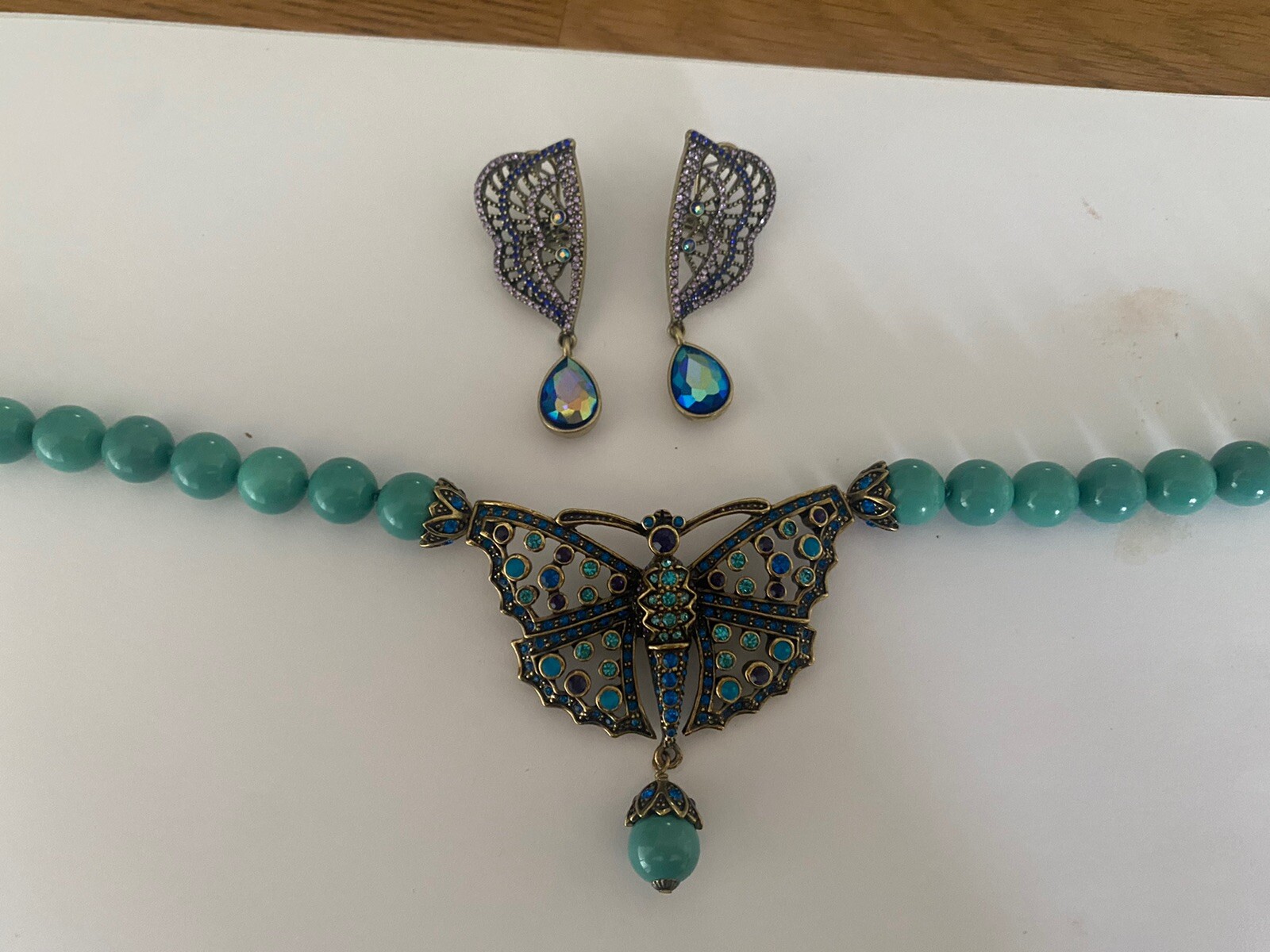 16β 4β extender 2β wings. Soar in butterfly beauty The necklace is a vintage HEIDI DAUS original. The earrings are a newer Heidi DAUS coordinating lovely companion piece making a one of a kind set for someone truly specialπ. GORGEOUS. LARGE SLEEPING. BEAUTY color cool smooth beads JUST beautiful and serene. Treat yourself! Butterfly lovers!!