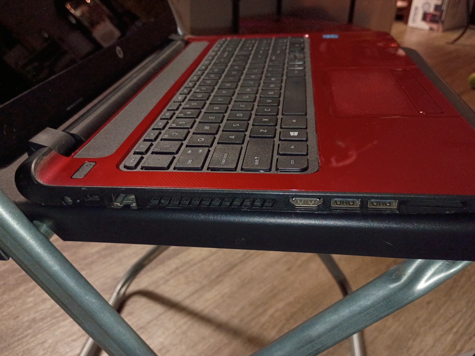 HP Pavilion 15 laptop in red finish. Unit is functional and has been factory reset. Runs and boots normally. Cosmetic condition is good with some light scratches on the exterior. Screen appears undamaged. Internal specifications and battery condition cannot be verified.