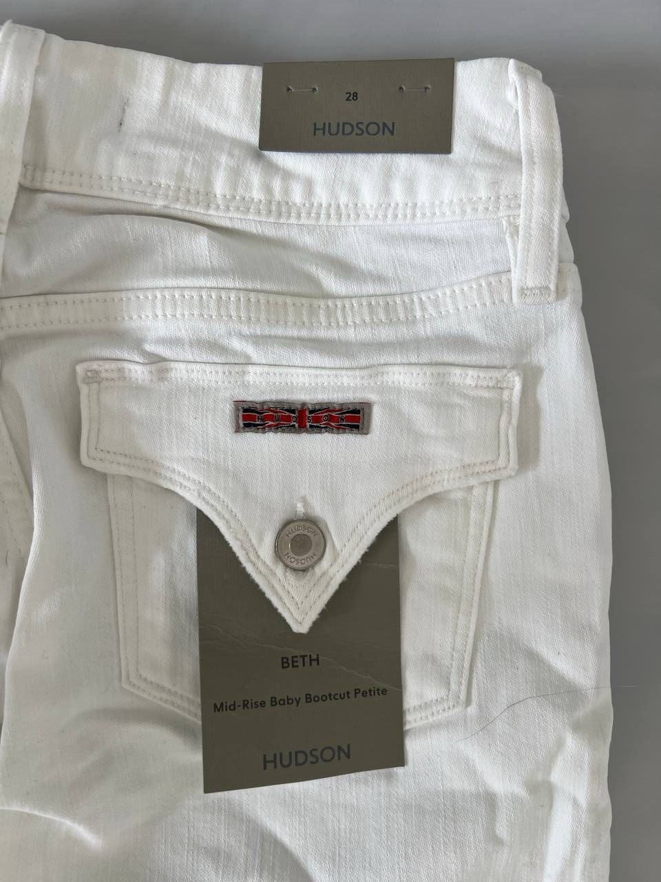 Experience timeless style with the HUDSON Jeans Women's Beth Mid Rise Baby Bootcut Jean in a crisp white. Designed for the modern woman, these jeans feature a comfortable mid-rise and a flattering bootcut silhouette. The size 28 ensures a snug fit for those who prefer their denim tailored to perfection. Crafted from a quality blend of cotton and cotton blend materials, these jeans promise both durability and comfort. The classic 5-pocket design adds functionality to this sleek denim, making it an essential addition to your wardrobe. The zip and button closure ensures a secure fit, while machine washability offers easy care. Elevate your everyday look with these effortlessly stylish jeans.