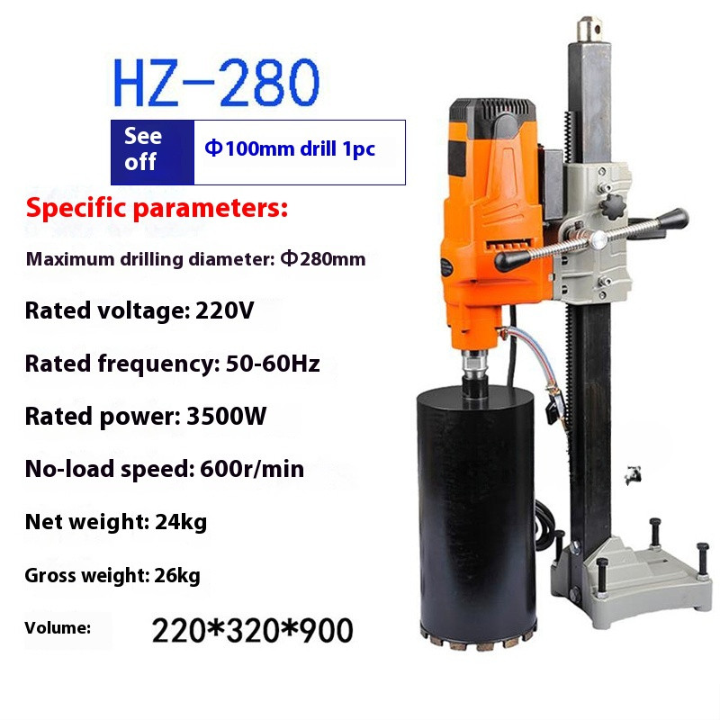 HZ-205F Core Drilling Machine Tongling Changjiang Concrete Core Drilling Machine Electric Highway Drilling Machine HZ-250 Specific Parameters. Drilling diameter:250mm Rated voltage:220V Rated frequency:50-60Hz Rated power:3300W No-load speed:640r/min Net weight:24kg Gross weight:26kg Volume:220*320*900