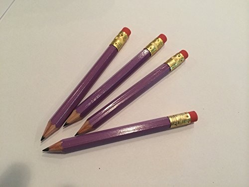Product Page Half Pencils with Eraser - Golf, Classroom, Pew, Short, Mini, Small, C Office Product Description: Save money with these high quality wooden half pencils. They have an eraser which will last as long as the pencil! The pencils have a laytex free eraser and are made in the USA and are PMA approved. They have so many uses, it is left only to your imagination. Package of 36 Lilac Golf Pocket Pencils, hexagon shaped so they don't roll off your desk! Great for school, office, church or home use. Features: Golf Pocket Pencils Sharpened, hexagon shaped, Lilac (purple) color with pink/red eraser. Short Mini Half Pencils, #2 HB Graphite lead. Laytex Free Eraser Ideal for Score Keeping, Pews, Classroom, Parties, Events, Anywhere Encourages better palmer arch and firmer grasp Made in the USA - PMA Approved