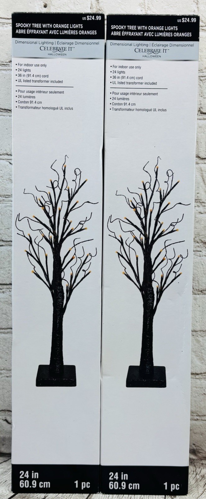 Halloween Black Spooky Trees Set of 2 Light Up 24” Celebrate It Orange Lights Bring eerie ambiance to your Halloween décor with this set of two light-up spooky trees from Celebrate It. Each tree stands 24 inches tall with black glittered branches tipped with glowing orange lights. The bendable, posable branches let you shape them to your liking, making them perfect for tabletops, entryways, or haunted displays. •Brand: Celebrate It Halloween •Set includes: 2 spooky black trees •Height: 24 inches each (60.9 cm) •Lights: 24 orange lights per tree •Branches: Bendable and posable •Cord: 36 inches (91.4 cm) with UL-listed transformer •Condition: Boxes show wear; trees appear new or mint condition •Use: Indoor only A glowing Halloween decoration set that adds just the right spooky touch. Ships securely with care.