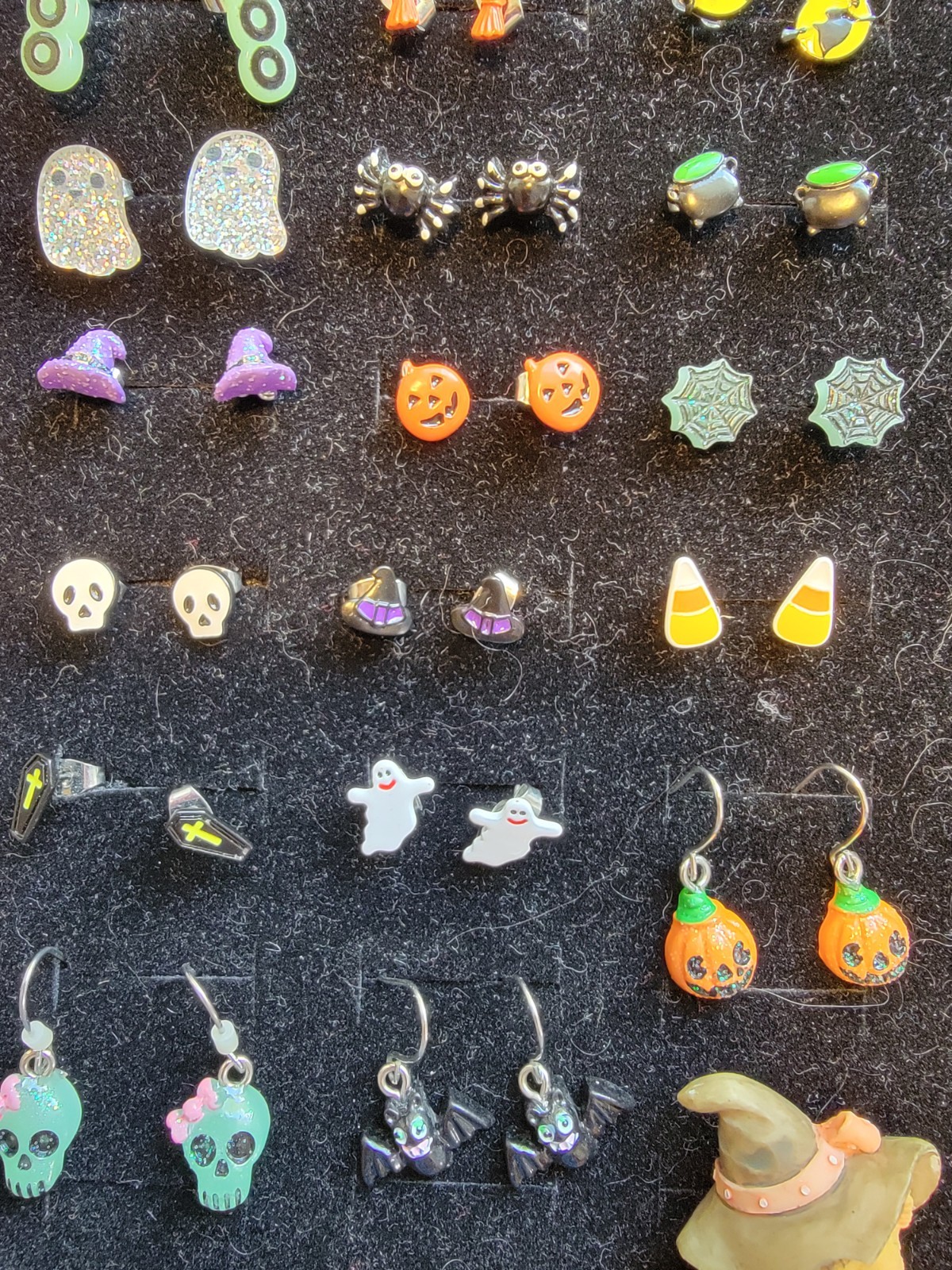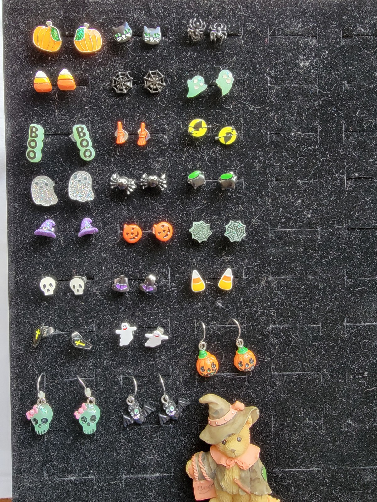 This product is a set of 21 pairs of Halloween-themed earrings, ranging in shape and style from stud to dangle/drop, made of enamel material in multicolor. Each pair features a different Halloween design, perfect for adding a touch of festive flair to your outfit. The set also includes an additional bear pin for added versatility in accessorizing. The earrings have a post and hook closure, making them easy to wear and suitable for Halloween occasions. This set is great for adding a fun and festive touch to your Halloween ensemble.