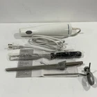 Introducing the Hamilton Beach Electric Knife, a versatile kitchen tool perfect for slicing, carving, and baking. This electric knife comes with a storage case, bread guide, and carving fork, making it a complete set for all your baking needs. Its 100W power and 120V voltage make it a powerful tool for any kitchen. The Hamilton Beach Electric Knife is designed with a white plastic material and features a single blade. It is not compliant with Energy Star and does not come with a manufacturer warranty. However, it is a great addition to any kitchen, especially for those who enjoy baking.
