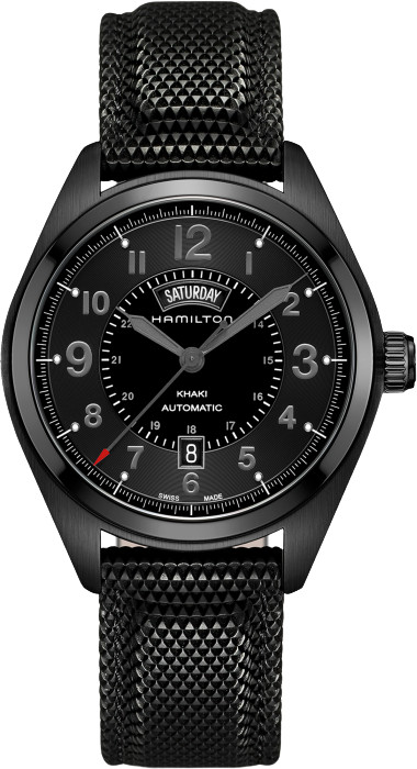 The Hamilton Khaki Field Day Date Automatic Men's Watch H70695735 is a stylish and functional timepiece with a black PVD case and black bezel. This Swiss-made watch features a mechanical automatic movement, water resistance up to 50 meters, and a transparent caseback. The watch includes Arabic numeral indices, a left-handed design, and a power reserve indicator. It comes with a textile band, a buckle closure, and a 42mm round case, making it ideal for casual wear. With a 5 ATM water resistance and sapphire crystal, this watch is both practical and durable for everyday use.