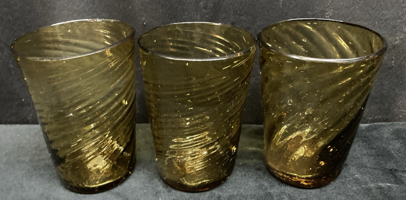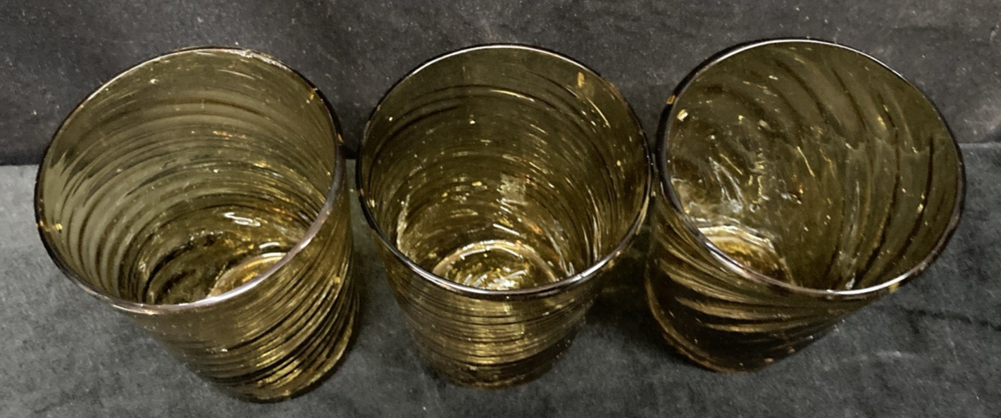 This set of three hand-blown amber swirl glasses are a beautiful addition to any drinkware collection. Each glass holds 9oz and is meticulously crafted with a swirl pattern, making them perfect for all occasions. The set is pre-owned and comes in good, clean condition with no chips, cracks, or breaks. Please see pictures for details. If you any questions or concerns, please do not hesitate to contact us. Check out our other items and message us if interested in more than one listing as combining items could save you money on shipping.