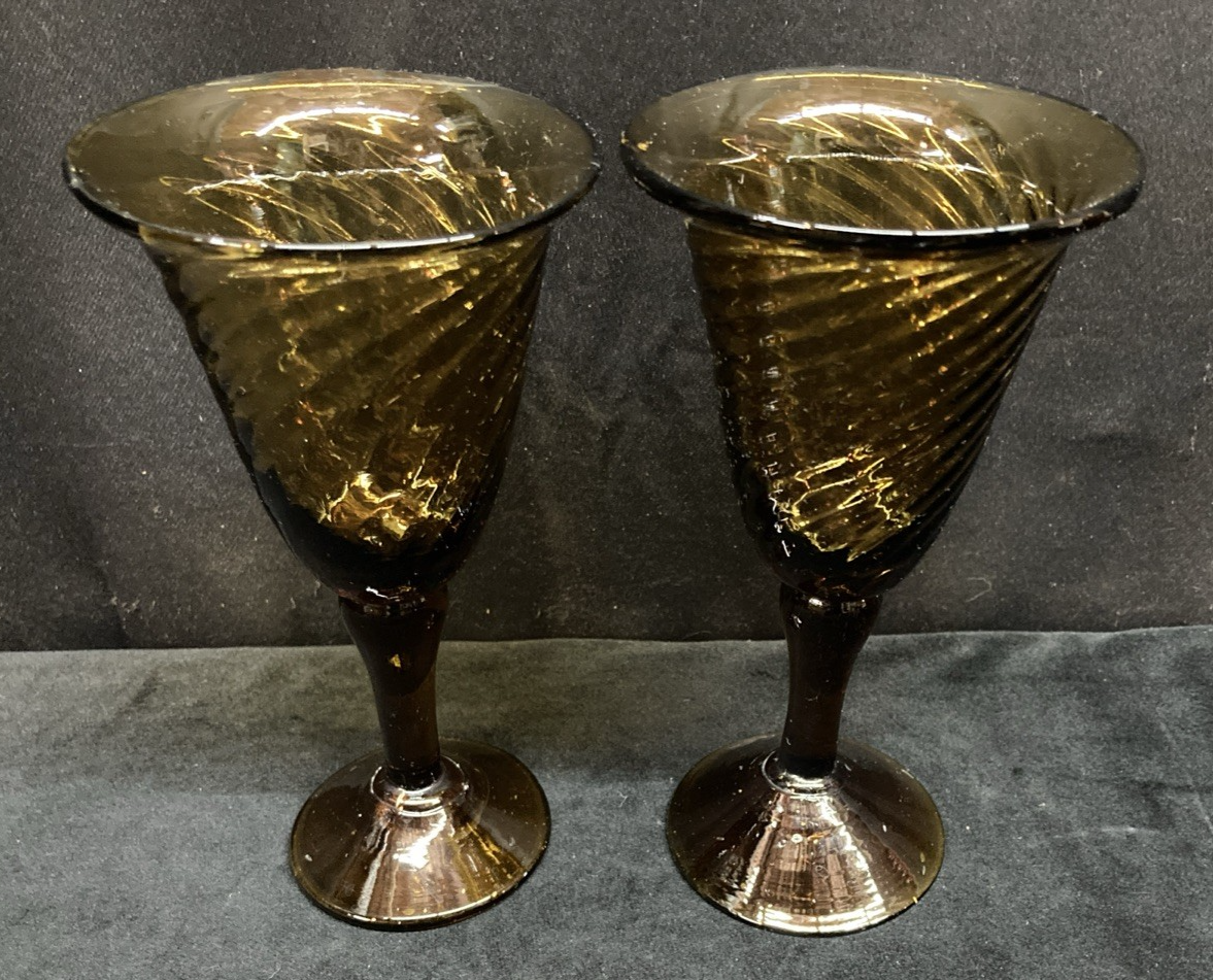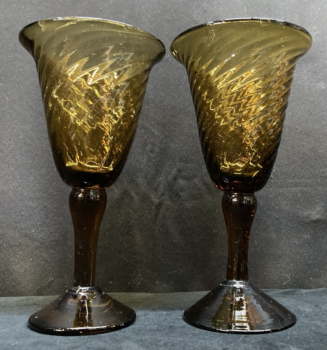 This set of three hand-blown amber swirl stemware glasses are a beautiful addition to any drinkware collection. Each glass holds 5oz and is meticulously crafted with a swirl pattern, making them perfect for all occasions. The set is pre-owned and comes in good, clean condition with no chips, cracks, or breaks. Please see pictures for details. If you any questions or concerns, please do not hesitate to contact us. Check out our other items and message us if interested in more than one listing as combining items could save you money on shipping.