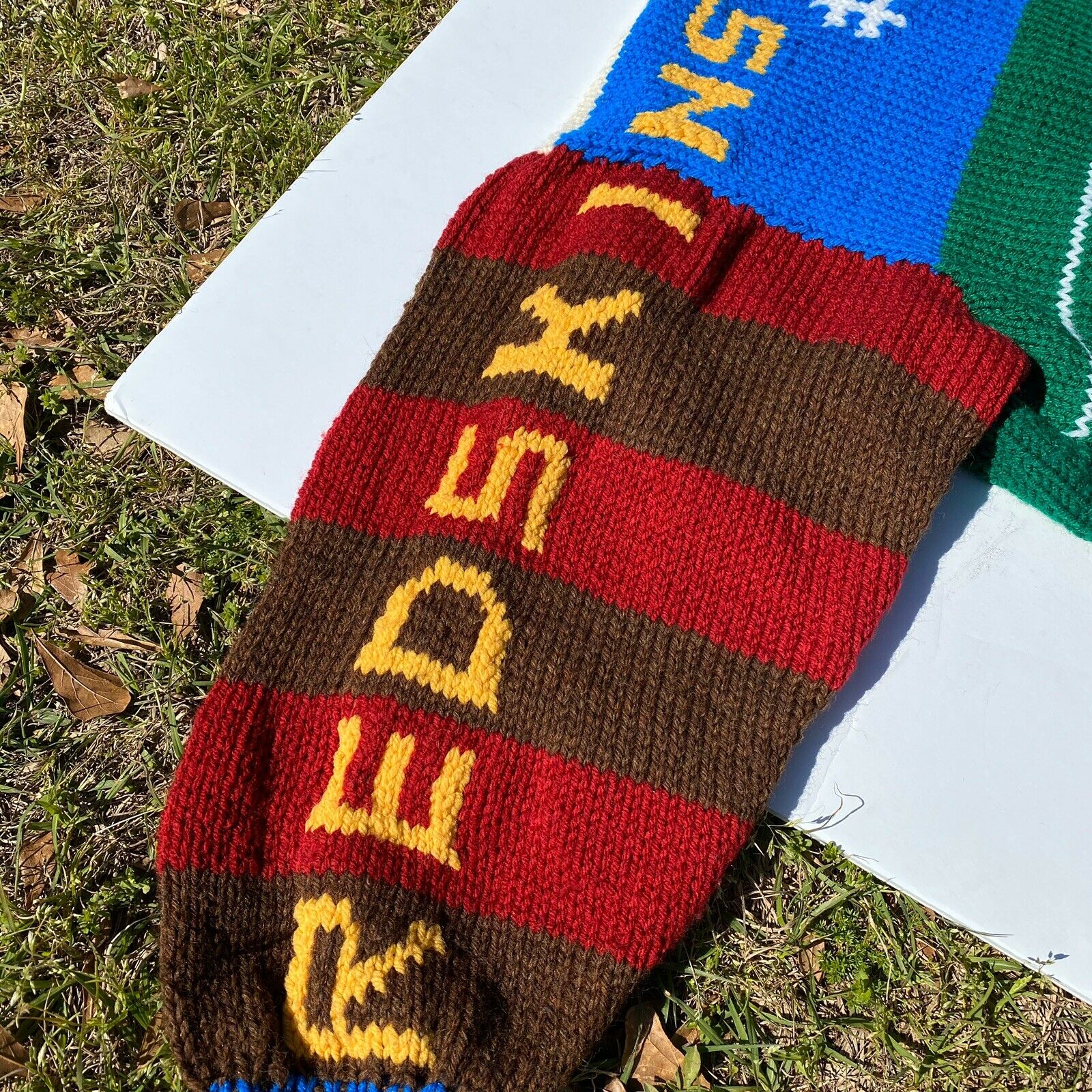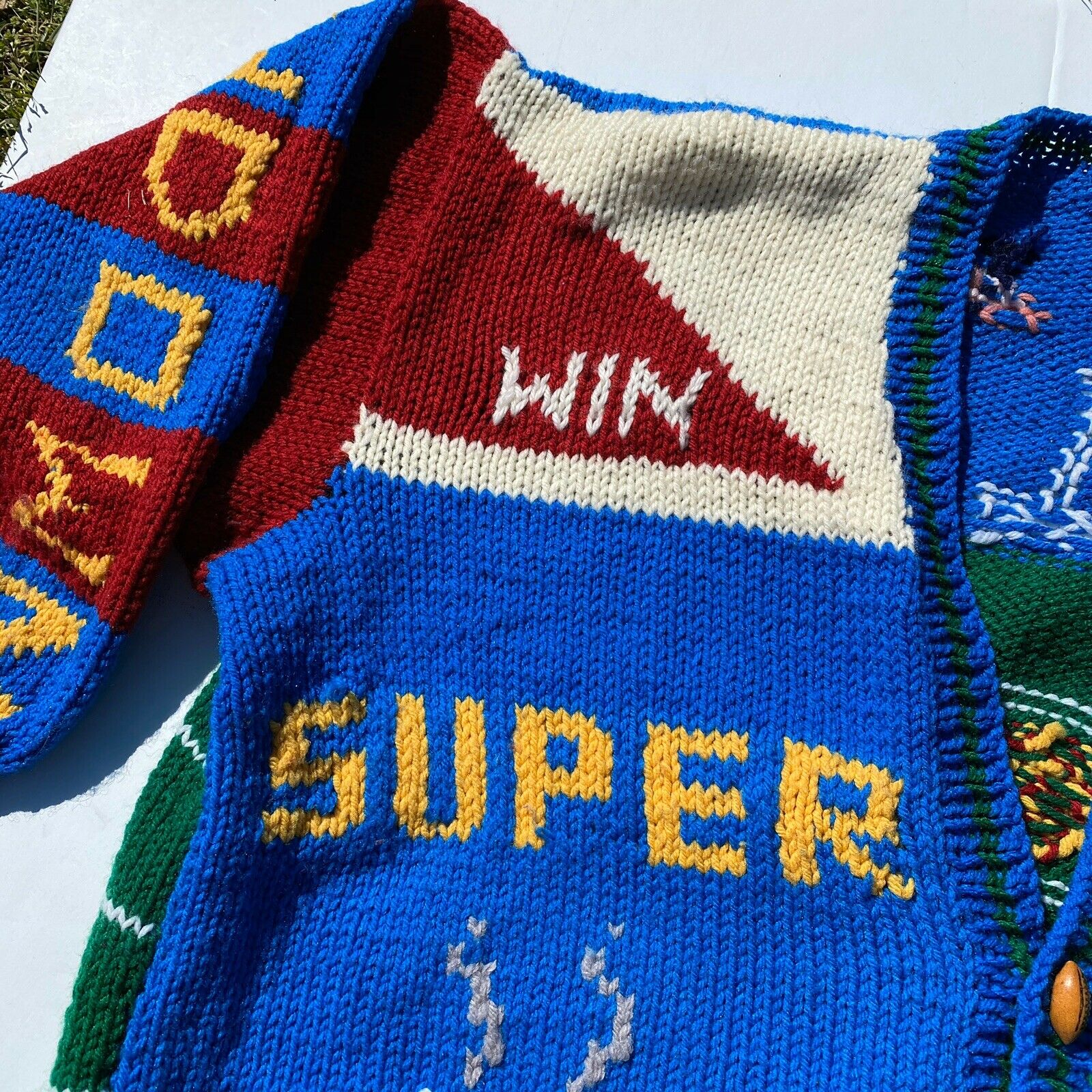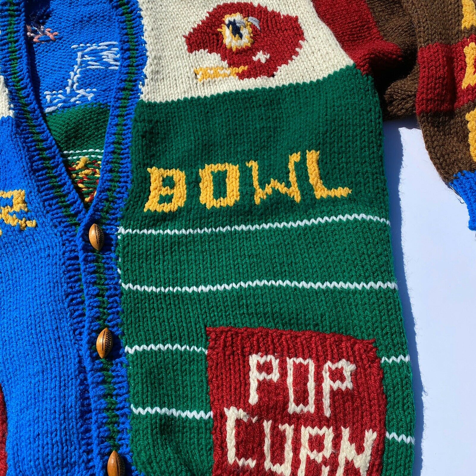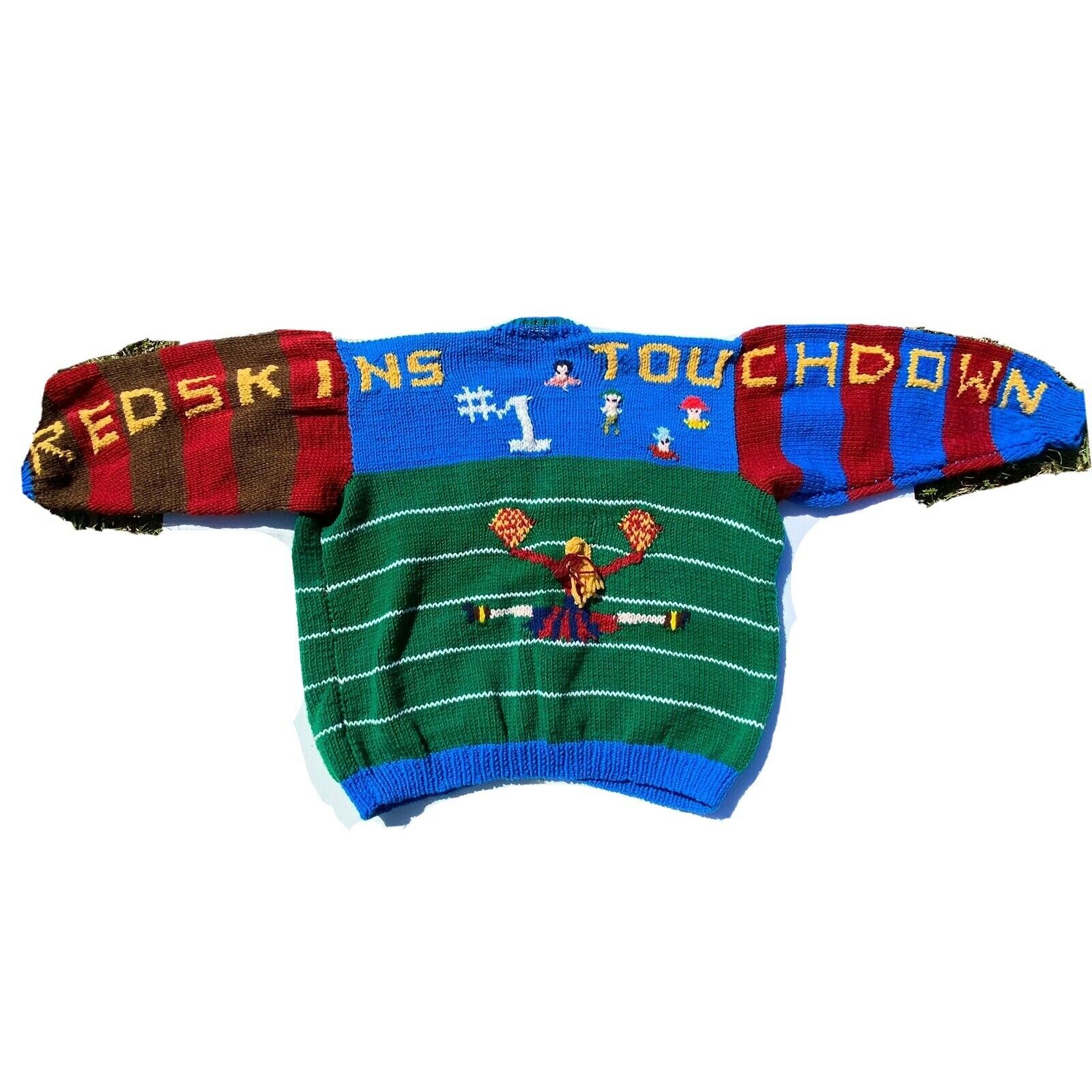 Washington Redskins Super Bowl Hand Made Knit Sweater - VG condition Hand make, Knit sweater to celebrate (or commemorate) one of the Washington Redskins' Super Bowls. No rips or tears or signs of misuse or excessive wear (it's not like Washington has been close to a Super Bowl in many, MANY years). An obvious project of love, the sweater features some nice workmanship with a helmet, a mug of Cocoa and popcorn on the front, Touchdown Redskins across both sleeves, and a football field with a cheerleader doing a jump splits (with tuffs of yard as her hair). Quite Cool. I wear a large, and this fits me well. I would say it's a tad smaller than a large, but quite wearable by a large. Laid flat, it measures 22" from the top of the collar to the bottom hem, 22" across the bottom. Sleeves measure 20" from the top shoulder seam to the cuff. Cute footballs for buttons. Just a great hand-made project, perfect for that Redskins fan. #1911