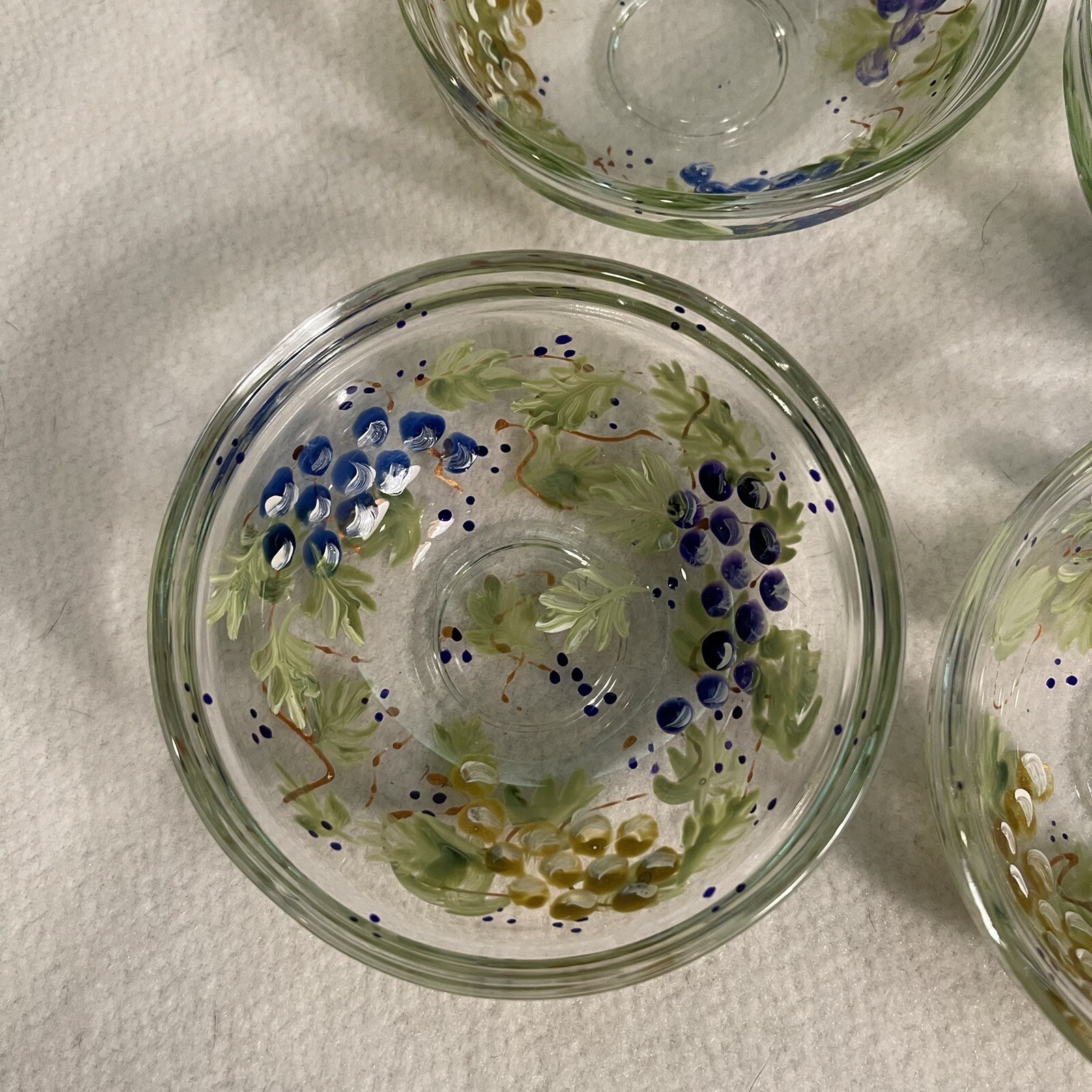 This is a vintage set of four hand-painted decorative bowls made of clear glass. Each bowl has a grapevine pattern fused into the glass, giving it an art nouveau style. Measuring 3.5 inches in diameter and 1.5 inches in height, these bowls are suitable for all occasions and can be used for serving dips, sauces, or as prep bowls. The set weighs 25.8 ounces and is from the 1980s, featuring a multicolor design that adds a touch of elegance to any table setting. Excellent condition. No chips or cracks.