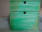 This is a hand painted Jewelry box or Organizer is 1 of 1 Original paint. The colors are pastel green in the front, one side is purple, one side is pink, and the top is turquoise with gold pen circles. This is will brighten your room or office, it is a cute conversational piece. The dimensions are 11 inches high, 11 inches wide, 8 inches deep. And weighs 3.0 pounds. One small indention on right side of the top hole pictured above, does not deter from the jewelry box.