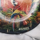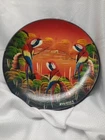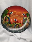 This is a hand-painted plate featuring a parrot, macaw, and cockatiel design. The plate is a vintage item from Peru and is signed by the artist. It is a collectible item that would make a great addition to any home decor.