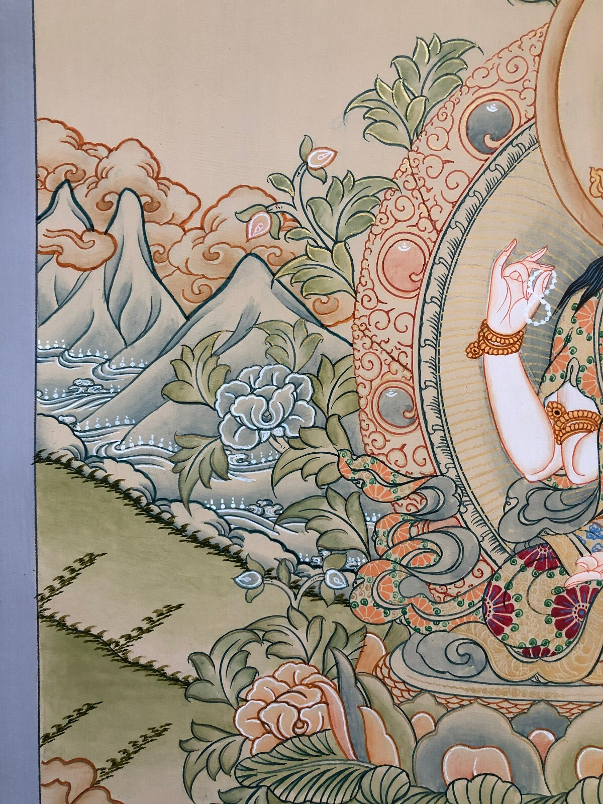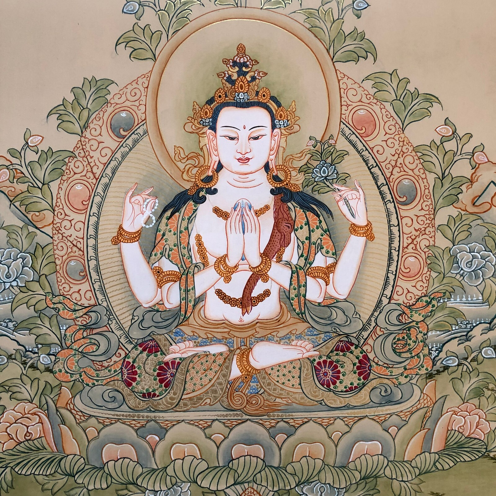 Namaste and Welcome to my Gallery!!! All of the paintings and arts in my gallery are originally handmade and hand-painted by my family members and other local artists who have been practicing their craft for over two decades. My father is Master Artists Nepal with an experience of more than four decades; you can see some of his work in this Gallery. Also you can see some of the beautiful and soulful artwork of talented local artists from Himalayas. ~~Chenrezig Thangka Painting~~ Silk brocading is a process of framing a Thangka in traditional Tibetan style. The frame is made of beautiful silk fabric having rich colors and patterns. The silk fabric protects the edges of the Thangka, and also makes it easier to hang. A thin silk cover protects the painting when rolled, and may be gathered up to display the painting when hung on the wall. It is generally thought that silk brocade renders a Thangka more attractive and more religious. He is white in colour, four armed carrying rosary in the right hand and full blown lotus in left. The other two principal hands are raised to the chest with the palms enjoined in Namaskar Mudra holding a round object known as “jewel” which is regarded as a symbol knowledge. [Size = 107cm x 81cm] Material Used: • Cotton Canvas • Natural Pigments and colors • Gold leaf • Silk Fabric ~Excellent for meditation or home/office decor, ~Tibetan Yoga Wall Art ~Genuine 100% hand-painted from Himalayas Please feel free to contact me if you have any question regarding the painting.