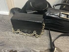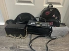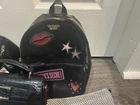 victoria secret black backpack Love Victoria. 1- backpack 2-Zara bags 1- belt bag 1-rhinestone evening bag Great Condition! Polyurethane mini backpack with patches! Front pocket with zipper Adjustable gold chain straps 9 1/2"H x 7 5/8"W x 3 3/4"D