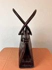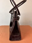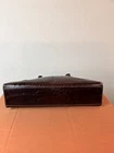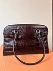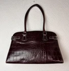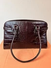 This exquisite handbag is perfect for the modern woman who wants to make a statement with her accessories. The bag is made of leather with an embossed alligator pattern and comes in a beautiful brown color. It features double handles made of fleather with brown color, and gold hardware accents that add a touch of elegance to the overall design. This medium-sized handbag has a rectangular shape and measures 15 inches in width, 11 inches in height, and 4 inches in depth. It has a fabric lining in gold color and inner pockets to carry all your essentials such as your phone, wallet, and keys. This bag is perfect for any occasion, whether it's for travel, casual outings, or business events.