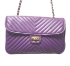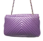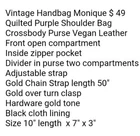 Vintage Handbag Monique $ 49 Quilted Purple Shoulder Bag Crossbody Purse Vegan Leather Front open compartment Inside zipper pocket Divider in purse two compartments Adjustable strap Gold Chain Strap length 50" Gold over turn clasp Hardware gold tone Black cloth lining Size 10" length x 7" x 3"