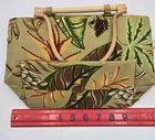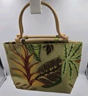 Purchased in a lot with several other purses at an estate sale, so I don't know a lot about them. Pirse is in excellent condition. This large square handbag by Mystique features a tropical Hawaiian design with beaded accents, perfect for a casual occasion. The bag is adorned with a pattern of leaves and has a wooden loop handle made of bamboo, adding to its unique and vintage charm. The exterior is crafted with beads and fabric, while the interior is lined with a beige color. This handmade bag exudes a hippie, tropical, and Aloha theme, making it a standout accessory for women looking to add a touch of exotic flair to their outfit.