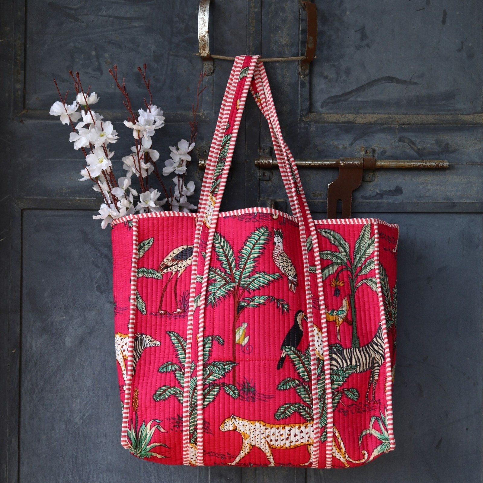 Material: Cotton Design: Small Buta Dimensions: Length : 15″ Height : 17″ Width : 5.5″ Technique : Quilting /Block Printed Usage : Perfect for groceries, work, travel, beach trips, or as a stylish everyday accessory. Customization : Available Stylish and Functional Design Introducing our Cotton Quilted Tote Bag, a perfect blend of style and functionality. With its vibrant Nature Style prints, this tote bag not only complements your outfit but also brings a touch of nature wherever you go. Crafted from high-quality cotton, this quilted tote bag is both lightweight and durable. It’s designed to withstand everyday wear and tear while providing an eco-friendly alternative to traditional plastic bags. Go green while looking fabulous! With its comfortable straps and functional design, staying organized has never looked so good. Smart Storage Inside, you’ll find a convenient pocket, ideal for storing smaller items like your phone or wallet, making it easy to stay organized. Wash Care : To ensure your cotton quilted tote bag remains in good condition, always opt for a gentle wash cycle. Hand washing is preferable; if machine washing, use a laundry mesh bag to protect the fabric. Use cold water and mild detergent to avoid fading.