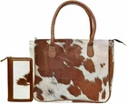 Women's Cowhide Purse Tote with Freebie Clutch The Classic Cowhide Tote is fully functional and offers just enough space to take all of your western style with you on the go. Features: human hair on the skin with full grain leather trim; Zipper; Double shoulder straps for easy carrying; An inside zip pocket, a cell phone pocket and a pen holder Dimensions - 15 "W x 11" H x 4.5 "D PLEASE NOTE: Hair on the skin is a natural product and will wear off under normal conditions. Each product may vary slightly in shade Length and color make each item unique. This product is only available in different colors and special color requests cannot be taken into account. WESTERN STYLE - The Classic Cowhide Tote with double shoulder straps for comfortable carrying is fully functional with just enough room to take all of your Western-style on the go MATERIAL - This tote bag is made of genuine hair on hide with full-grain leather trim; and this tote bag features inspirational quote on the interior lining EVERY BAG IS UNIQUE - Please note, each product may vary slightly in shading, hair length and color making each item a unique product. This product comes in assorted colors only and specific color requests cannot be accommodated