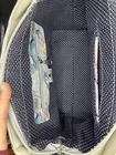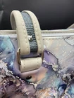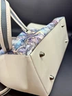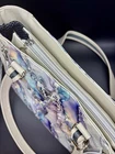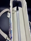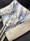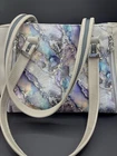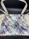 This one of a kind hand made bag has been handcrafted using only the highest quality fabrics and hardware. This large square shaped tote or shoulder bag has a large zippered section on the front, as well as a zippered pocket and a slip pocket inside. The outside print is a beautiful alcohol-ink inspired design in serene blues and purples. This is paired with a neutral beige faux leather and silver zipper pulls and zippers. The zippers have cute perfume bottle shaped zipper pulls to add to the charm. The base of the bag has purse feet to help reduce wear and tear and is reinforced with a sturdy stabiliser. The measurements of this bag is as follows: Height - 22cm Width - 37cm (at the widest point at the top) Depth - 14cm Handle drop - 30.5cm In stock and ready to ship!
