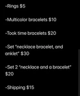 The Looms -The bracelets are $5 -The necklaces are $15 -The Charm necklace are $20 -Anklets bracelet are $10 -Bracelet with charms $15 -Beads bracelet $15 -Bead necklace $25 -Baby necklace $15 -Rings $5 -Multicolor bracelets $10 -Took time bracelets $20 -Set “necklace bracelet, and anklet” $30 -Set 2 “necklace and a bracelet” $20 -Shipping $15