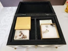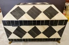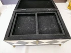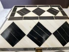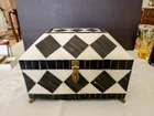 The "HARLEQUIN JEWELRY BOX" is a handcrafted rectangular jewelry box made with black and white bone inlay. It includes a gift box and has a velvet lining. Suitable for storing various types of jewelry such as necklaces, bracelets, rings, cufflinks, earrings, and body jewelry. This unique jewelry box is available at MOMA Gift Shop. A imported by Harlequin Co, for MOMA/NYC. 98 till 2000, Inlaid all over Jewelry Box, we bought the last one the shop demo, as it was/is condition, they couldn't find org box, so they packaged in regular brown corrugated along with numerous other items, some are shown in one of photos and do not come with empty box ain as we bought it orginal condition. Looks just like it di in store/gift shop at MOMA, 5/2000. Outside measurements are: 12.5 inches wide, 9 inches tall at center, and 8 inches in depth/sides, has the one lift out lid and more space below. A Little dusty, but very good org condition, quite heavy actually empty, as is, condition. They told us these were imported by one of their suppliers from Africa and it is part US Trade Program to/for Aid, Black and White Bone inlays abound all around, pretty well done, well made, strong feeling. Pls it in some ways helps education in an African Village, per MOMA sales lady!
