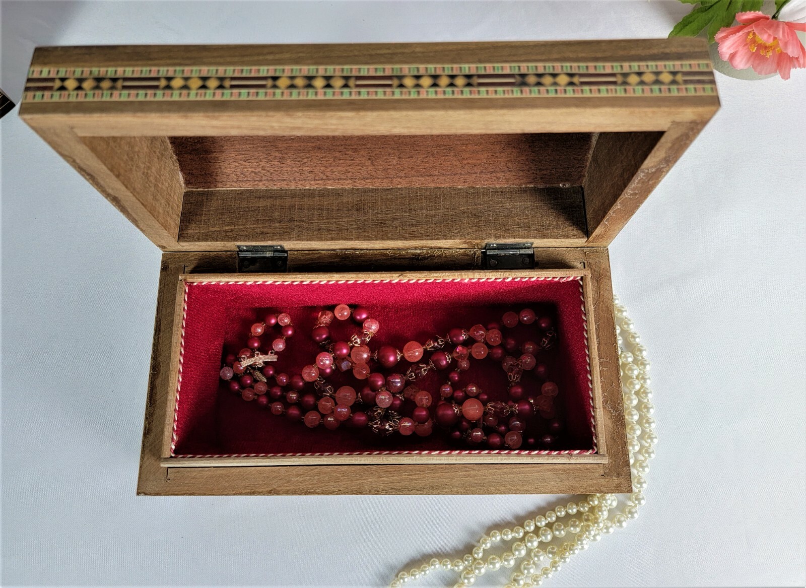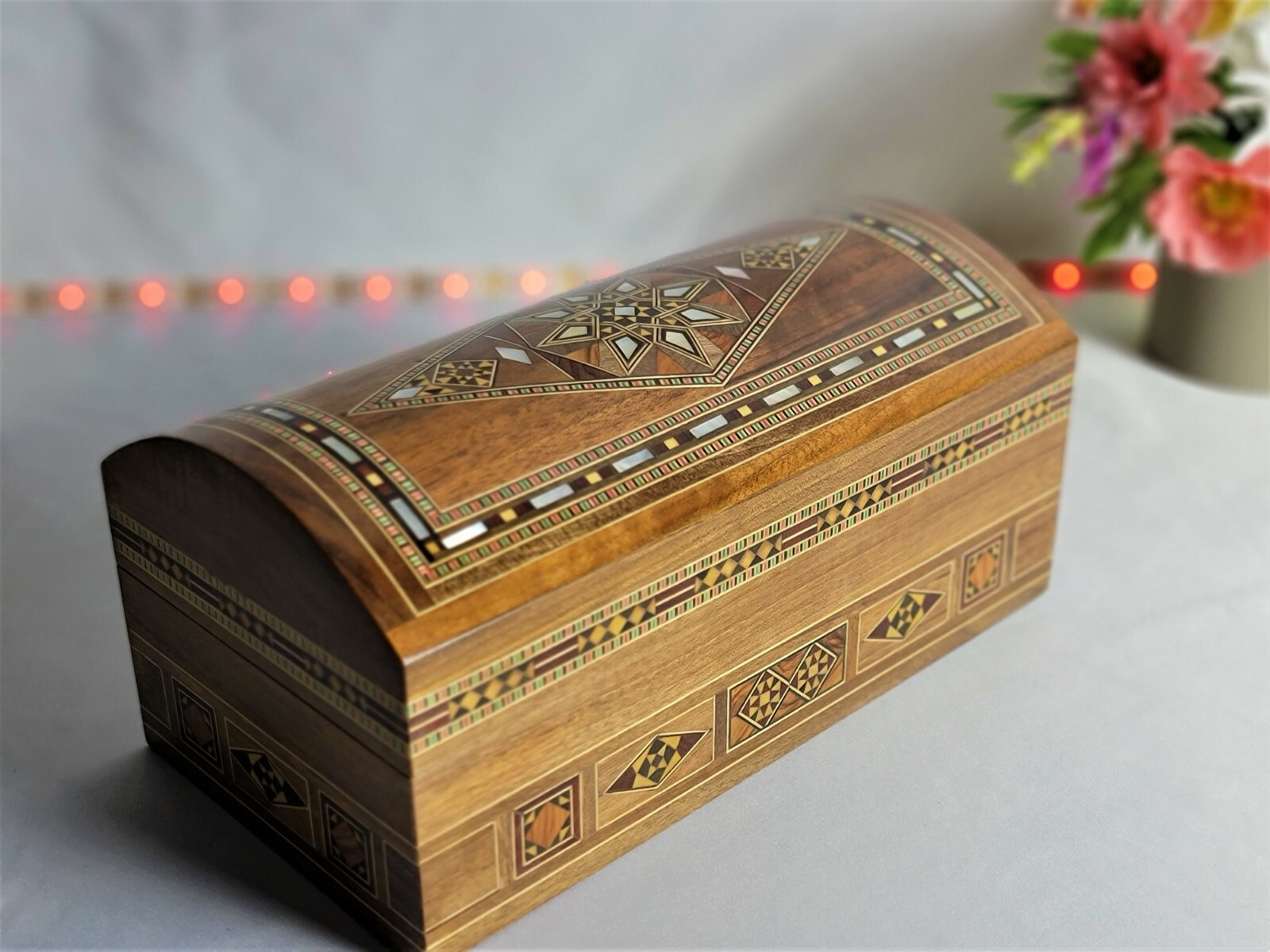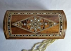 This truly jewelry box is the perfect gift for Christmas Gift, Mother's Day, a wedding, birthdays, graduation or any special occasion. This amazing mosaic .design wooden box from the Middle East, and the ancient tradition of wood inlay. Beginning in Damascus, the technique has been perfected over hundreds of years. Artisans carefully cut and shape wood and shell pieces, then glue them into precisely cut cavities. The whole surface is then sanded smooth and sealed. All of this is done by hand, as it has been from the beginning, and is a painstaking process that produces an incredible work of craftsmanship. Using walnut wood as the base of this box, the pattern is first drawn and transferred to the surface, then formed by inlaying small pieces of indigenous woods (olive, lemon wood), each with their own color and properties. Mother of pearl shell, particularly difficult to work with, is used to accent the design. - Number : 830 - Dimensions : 9.5"(24 cm) L, 5"(13 cm) W, and 4.5"(11.5 cm) H. Weight : 1.14 Lbs. _ (800)G. - You will receive the same design shown in the photo . - the item is ready to ship. - This product is made by hand and natural materials used. All our products are handmade by traditional Syrian. Each item is a piece of art, stylish and modern but timelessly infused with the historical spirit of the Middle East As of any truly handmade product, there are few flaws and imperfections. Thank you for choosing handmade and supporting Ebay!