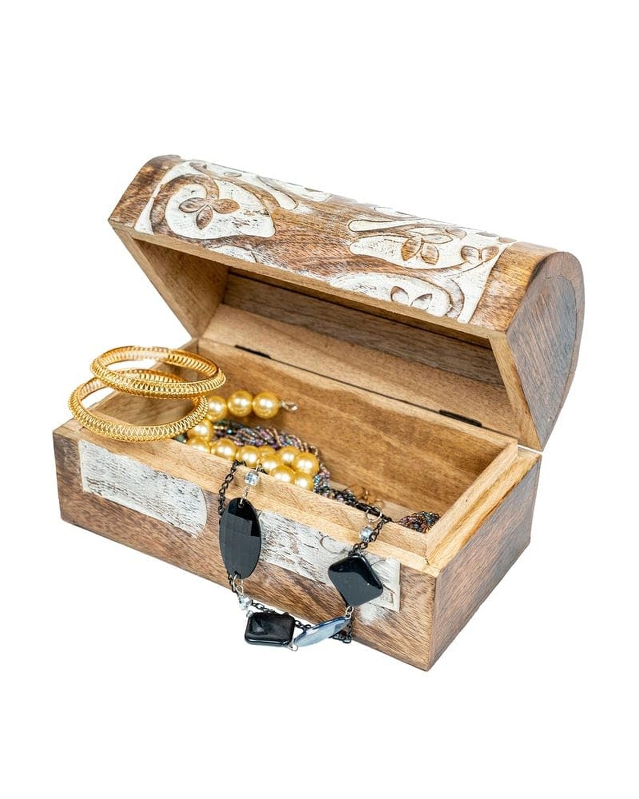 Handcrafted, Wooden Jewelry Box, Keepsake Storage Organizer, Treasure Box, Treasure Chest, Trinket Holder, Watch Box, Beautiful Gift Idea (Tree of Life 3) Product Details Color: Brown Brand: Simbakart Material: Wood Style: Tree of Life 3 Special Feature: carved Recommended Uses For Product: Bangle Product Dimensions: 8"D x 5"W x 2.5"H Target Audience: Boys Shape: Rectangular Occasion: Engagement, Bridal Shower, Christmas, Anniversary, Birthday Item Weight: 0.35 Kilograms Item Dimensions D x W x H: 8"D x 5"W x 2.5"H Shape: Rectangular Occasion: Engagement, Bridal Shower, Christmas, Anniversary, Birthday Style: Tree of Life 3 Color: Brown Material: Wood Warranty Type: no warranty Manufacturer: SimbaKart Brand Name: Simbakart Recommended Uses For Product: Bangle Target Audience: Boys Number of Items: 1 Jewelry Storage Type: Jewelry Box Special Features: carved Hand Carved: This unique jewelry box is hand carved by the Indian Artisan with beautiful floral and inlay brass carving using the finest quality mango wood with fine texture and flawless finish. Multipurpose Storage: This box provides you with sufficient storage space for your jewelry, trinkets, charms, cufflinks etc. It can also be used to keep watches, tarot card and small treasures. It adds a perfect touch of class to your dressing table or any other desk. It looks great when placed against a bedside cabinet, shelf or counter top. Dimensions: The box is 8 inches in length, 5 inches wide and 2.5 inches in height. Decor: An Excellent piece of decor that can enhance the beauty of your home and office. The beautiful Brass Inlay Work is eye-catching which makes it a centre of attraction. Perfect gift: A perfect and exceptional gifting idea for your loved ones for House-warming, Birthday, Anniversary, Mother's Day, Valentine's Day leaving a great impression with your friends and family. NON-SLIP BASE: The base of the Jewelry Box has non-slip rubber pad, which makes it stable on the desk. This jewelry box is made of natural mango wood which is featured with enough space to keepsake your jewels and other precious things. This wooden jewelry box is modern and can enhance the beauty of home and office. The main purpose of the box is is to keep your precious personal belongings safe and organized such as earnings, rings, keepsakes, trinkets, etc. The prime use of this box is to keep your worldly things safe and scratch-free.