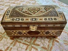 Mosaic Vintage Jewelry Box Handmade product composed mostly of solid walnut, then inlaid with a variety of different fruit woods. It is made by combining small pieces of wood together. Great Item to gift or use at home to store your jewelry. Can serve as a great gift for Mother's day, Thanks giving or House Warming. The item for sale is the Mosaic Box ONLY. External Size: 8.0 x 5.2 x 3.2 inches Internal Size: 6.7 x 4.0 x 2.5 inches ------------------------------------------------------------------------------------------------------------