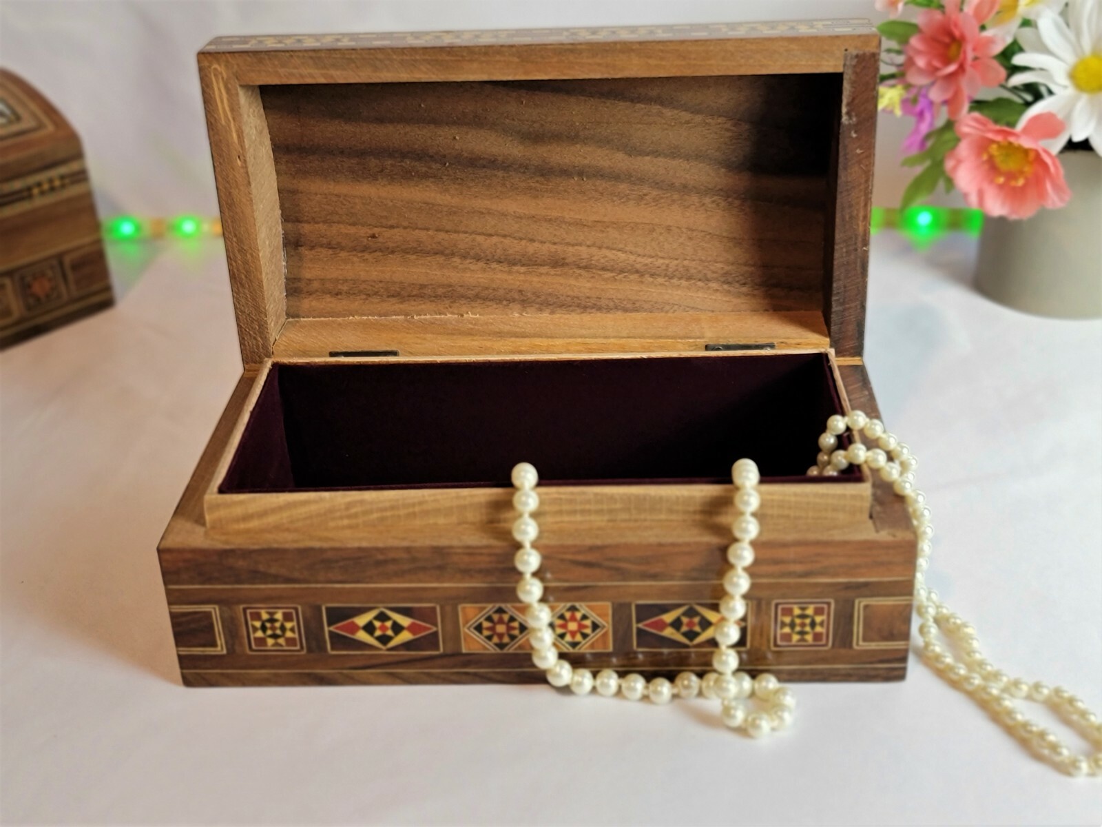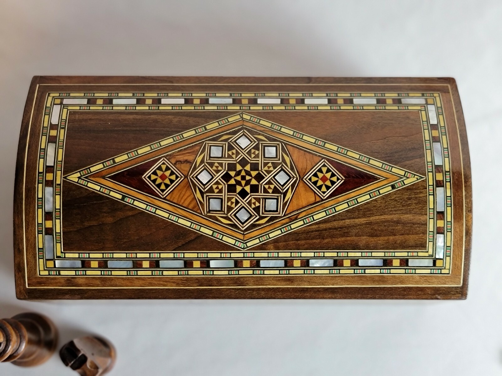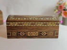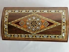 This truly jewelry box is the perfect gift for Christmas Gift, Mother's Day, a wedding, birthdays, graduation or any special occasion. This amazing mosaic .design wooden box from the Middle East, and the ancient tradition of wood inlay. Beginning in Damascus, the technique has been perfected over hundreds of years. Artisans carefully cut and shape wood and shell pieces, then glue them into precisely cut cavities. The whole surface is then sanded smooth and sealed. All of this is done by hand, as it has been from the beginning, and is a painstaking process that produces an incredible work of craftsmanship. Using walnut wood as the base of this box, the pattern is first drawn and transferred to the surface, then formed by inlaying small pieces of indigenous woods (olive, lemon wood), each with their own color and properties. Mother of pearl shell, particularly difficult to work with, is used to accent the design. - Number : 829 - Dimensions : 9"(23 cm) L, 5"(13 cm) W, and 4"(10 cm) H. Weight : 1.10 Lbs. _ (750)G. - You will receive the same design shown in the photo . - the item is ready to ship. - This product is made by hand and natural materials used. All our products are handmade by traditional Syrian. Each item is a piece of art, stylish and modern but timelessly infused with the historical spirit of the Middle East As of any truly handmade product, there are few flaws and imperfections. Thank you for choosing handmade and supporting Ebay!