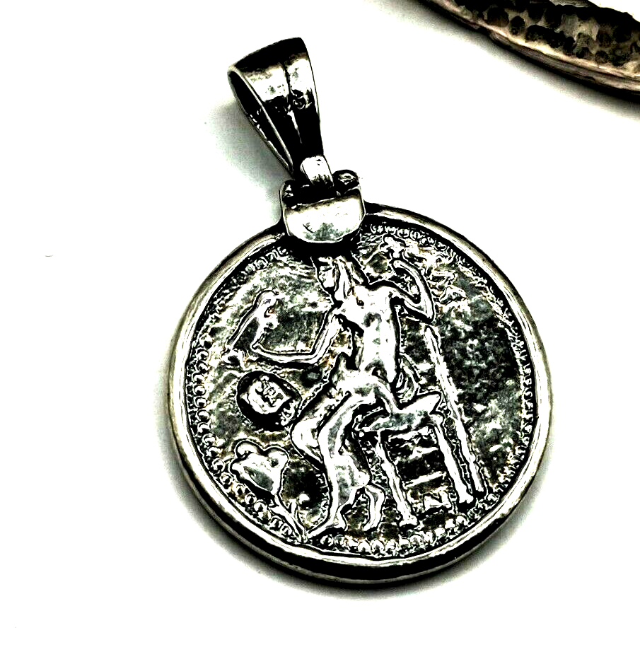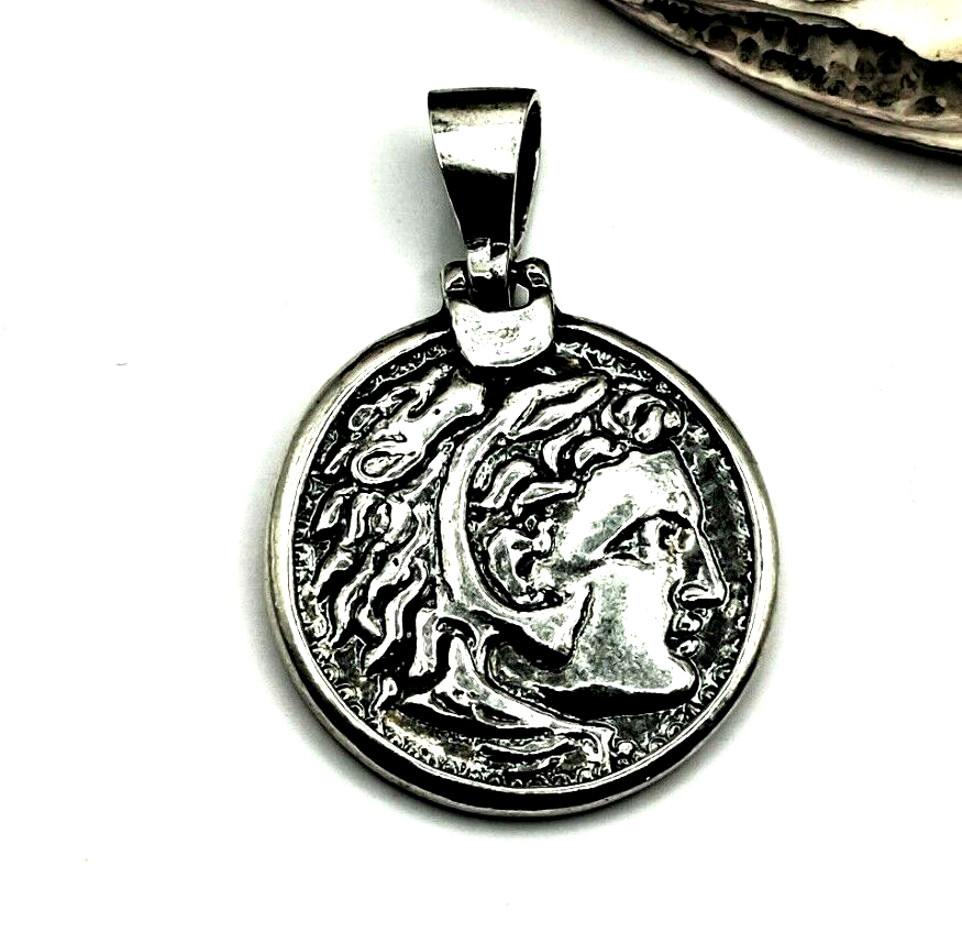 Buy a unique Handmade Ancient Greek Coin Alexander the Great Sterling Silver 925 Pendant | Discover a large collection of Ancient Greek Jewelry in our ON-LINE shop | FREE SHIPPING all over the world This product is a beautiful silver 925 pendant inspired by the Ancient Greek Alexander the Great Coin.This coin pendant shows the young beardless Hercules wearing a lion skin headdress.On the reverse Zeus seated on throne to the left holding eagle in right hand and scepter in left in left field PA monogram and angular sigma above grape vine arching over oinochoe ALEXANDROU vertical in right field.This coin is the Alexander the Great Tetradrachm. ***Type We offer 1 type of pendant(black oxidized). *** Size Height:3.4cm(1.36 inches) Width:2.2cm(0.88 inches) ***Material All my products are pure Sterling Silver. The oxidized version is created as follows: A piece of blackened or oxidized silver is true sterling silver I have intentionally darkened (oxidized) through by introducing it to a chemical process. This patina, a surface color that occurs when the silver is introduced to sulfides, is a sped up version of the natural tarnishing process. ***Processing Time All my products are ready to be shipped. We need 1-3 working days to ship this product. ***Estimated Shipping Time We ship for FREE with the National Greek Post Office. The following estimated times are given by the Post Office. Due to this crisis, I'm NOT responsible or predict possible delays. Greece: 3-5 business days United States: 10-35 business days North America: 10-35 business days Europe: 5-20 business days Australia, New Zealand and Oceania: 10-35 business days Asia Pacific: 10-35 business days Latin America and the Caribbean: 10-35 business days North Africa and the Middle East: 10-35 business days ***Customs I have NO responsability about customs import taxes and delays. ***Return of product I accept returns under the following conditions (following EU regulations) *The product will be shipped back in its initial condition before refunding *After we receive the product and check its condition, THEN you will be refunded *The cost for shipping back will be deducted from the refunding *The return of the product have to be shipped with the same shipping company (Post Office) *You will have to send me first the withdrawal FORM included in the package in the following e-mail: *I accept return within 14 days after reception. ***What do we mean by silver 925? Sterling is the jewelry quality standard in most world markets. It is an alloy of 92.5% silver. The remaining 7.5% is usually copper. I use this silver 925 in all my products. ***What symbolizes the Alexander the Great and Alexander Coins in Ancient Greece? Alexander the Great (Greek: ὁ Μέγας, ho Mégas), was a king of the ancient Greek kingdom of Macedon and a member of the Argead dynasty. He was born in Pella in 356 BC and succeeded his father Philip II to the throne at the age of 20. He spent most of his ruling years on an unprecedented military campaign through western Asia and northeast Africa, and by the age of thirty, he had created one of the largest empires of the ancient world, stretching from Greece to northwestern India.He was undefeated in battle and is widely considered one of history's most successful military commanders. Source:https://en.wikipedia.org/wiki/Alexander_the_Great The tetradrachm (Greek: τετράδραχμον, romanized: tetrádrachmon) was an Ancient Greek silver coin equivalent to four drachmae.In Athens it replaced the earlier "heraldic" type of didrachms and it was in wide circulation from c. 510 to c. 38 BC. The silver tetradrachm is believed to be the coin given to Judas for betraying Jesus. Source:https://en.wikipedia.org/wiki/Tetradrachm