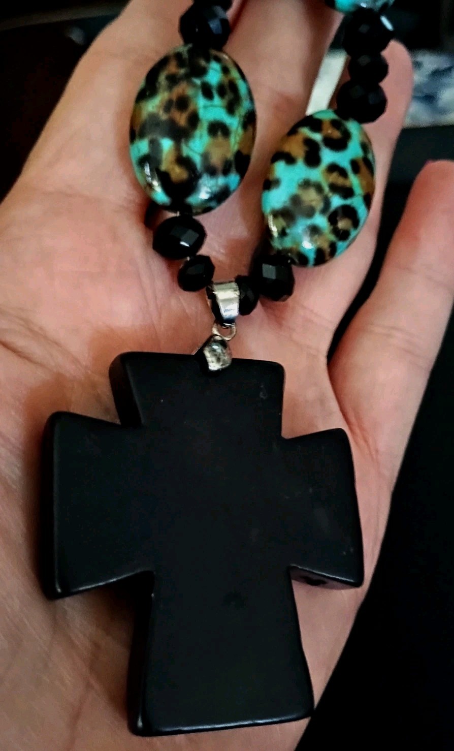 This handmade necklace features a beautiful black stone cross pendant with a silver chain. The pendant is crafted with attention to detail, making it a unique addition to your jewelry collection. The black stone is complemented by glass secondary stones, adding an extra touch of elegance to the piece. The necklace is 18 inches in length, making it perfect for everyday wear or to complete any outfit. The religious theme of the necklace makes it a great gift for loved ones or as a personal reminder of faith. Add a touch of style to your wardrobe with this Blackstone necklace.