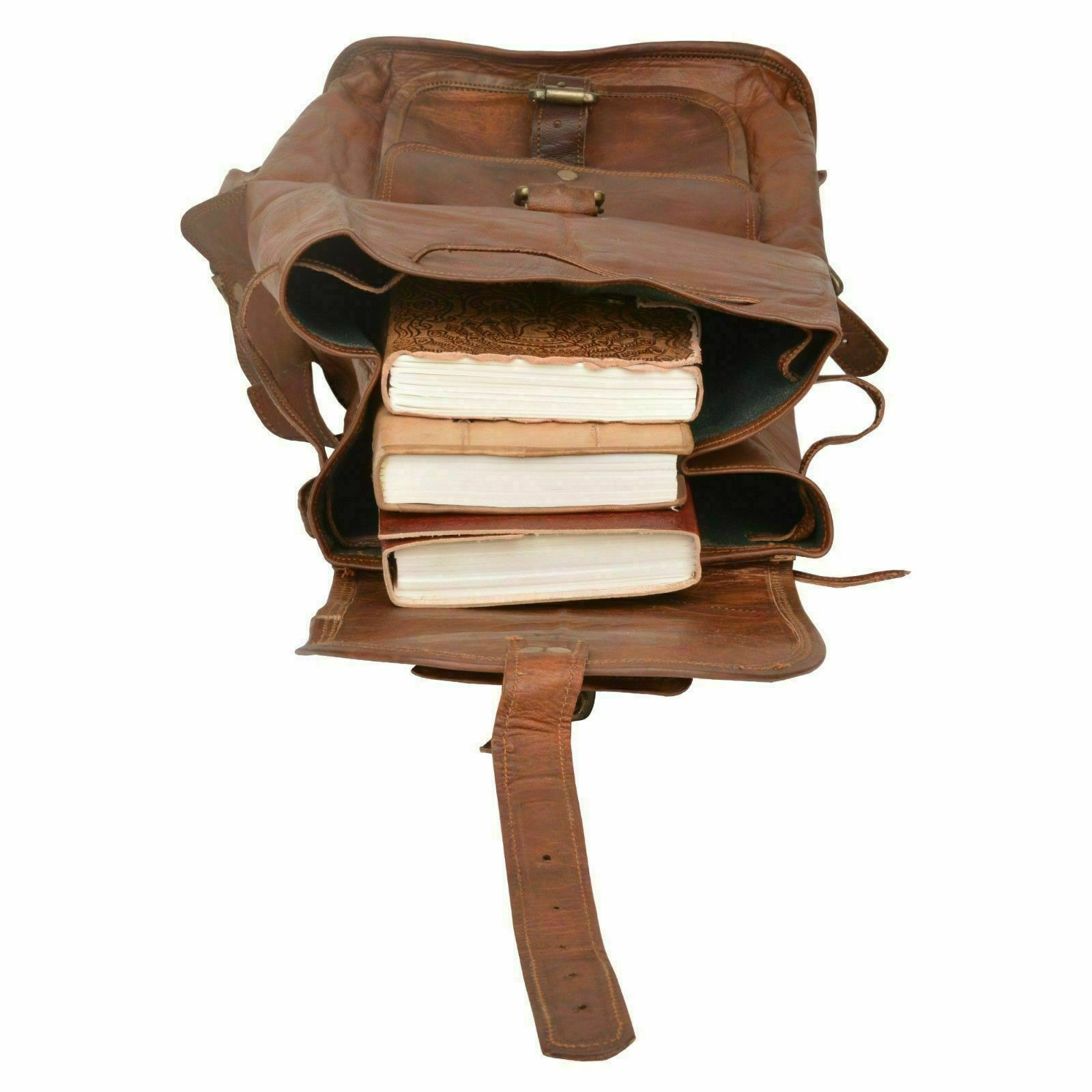 Material: Real Goat Leather Metal Used for Lock, Chain & Hooks : Brass Making : Handmade Size : 18 X 9 X 9 inch Features Green canvas fabric Internal 1 big compartment 4 small pockets ADJUSTABLE BACK SHOULDER STRIP Note : Handle on top, adjustable nice wide back straps. Has an inner stitched canvas for durability. 100% Genuine goat leather with a durable inner made of canvas. Natural oils used to give it polished look. No chemical has been used. It can be used to carry files, books, tablets, mini laptops, laptops etc. This bag is made of pure goat leather. It is handmade and made by professional workers. Leather softens and darkens with use. Natural leather smell fades with usage. Note:- Actual colors may vary from the color shown on your screen, as monitor settings may vary from individual to individual. It is made of genuine goat leather and the color of its is brown sometimes there may be differences in brown color.