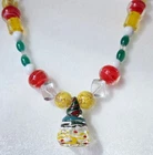 Add a pop of playful charm to your jewelry collection with this handcrafted beaded necklace featuring a festive lampwork glass pendant in a tree or whimsical bell shape. The strand is adorned with a fun mix of glass beads in yellow, red, teal, white, and clear, with crackle and swirl textures. Finished with a simple hook clasp, this necklace measures approximately 20 inches in length. Great unique boho-inspired styling. Condition: Very good handmade condition. Some minor wear on clasp components consistent with handmade nature.