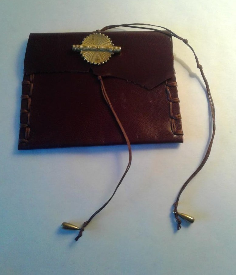 Exquisite Unisex Hand Made Maroon Brown Coin Purse/ Wallet/ Credit Card Case with an Antique Gold Tone Emblem on Top Flap Closure, Matching Hand Stitched Silk Thread and Matching Silk Tie Closures with Antique Gold Tone Beads. Size 4 1/2" x 3." Superb Presentation !