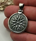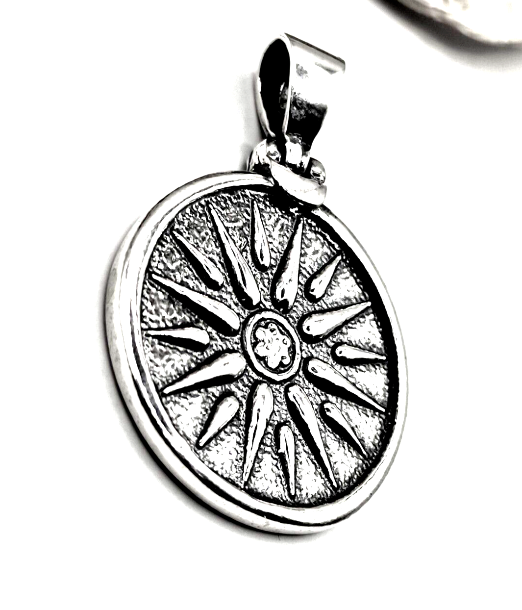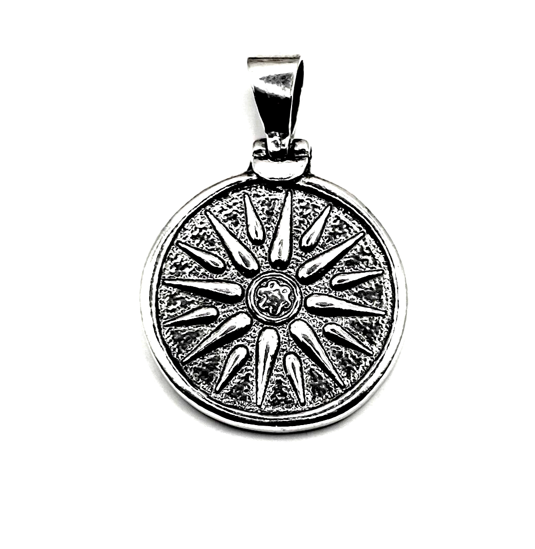 Buy a unique Handmade Sterling Silver 925 Ancient Greek Coin Vergina Sun Star Pendant | Discover a large collection of Ancient Greek Jewelry in our ON-LINE shop | FREE SHIPPING all over the world This product is a beautiful silver 925 pendant inspired by the Ancient Greek Vergina Sun.The Vergina Sun is a strong symbol in Greece.Vergina sun(star of vergina) is the historical symbol of the ancient kingdom of Macedonia and it has 16 triangular rays. ***Type We offer 1 type of pendant.(black oxidized) *** Size Height:3.4cm(1.36 inches) Width:2.3cm(0.92 inches) ***Material All my products are pure Sterling Silver. The oxidized version is created as follows: A piece of blackened or oxidized silver is true sterling silver I have intentionally darkened (oxidized) through by introducing it to a chemical process. This patina, a surface color that occurs when the silver is introduced to sulfides, is a sped up version of the natural tarnishing process. ***Processing Time All my products are ready to be shipped. We need 1-3 working days to ship this product. ***Estimated Shipping Time We ship for FREE with the National Greek Post Office. The following estimated times are given by the Post Office. Due to this crisis, I'm NOT responsible or predict possible delays. Greece: 3-5 business days United States: 10-35 business days North America: 10-35 business days Europe: 5-20 business days Australia, New Zealand and Oceania: 10-35 business days Asia Pacific: 10-35 business days Latin America and the Caribbean: 10-35 business days North Africa and the Middle East: 10-35 business days ***Customs I have NO responsability about customs import taxes and delays. ***Return of product I accept returns under the following conditions (following EU regulations) *The product will be shipped back in its initial condition before refunding *After we receive the product and check its condition, THEN you will be refunded *The cost for shipping back will be deducted from the refunding *The return of the product have to be shipped with the same shipping company (Post Office) *You will have to send me first the withdrawal FORM included in the package in the following e-mail: *I accept return within 14 days after reception. ***What do we mean by silver 925? Sterling is the jewelry quality standard in most world markets. It is an alloy of 92.5% silver. The remaining 7.5% is usually copper. I use this silver 925 in all my products. ***What symbolizes the Vergina Sun in Ancient Greece? The Vergina Sun also known as the Star of Vergina, Vergina Star or Argead Star, is a rayed solar symbol first appearing in ancient Greek art of the period between the 6th and 2nd centuries BC. The Vergina Sun proper has sixteen triangular rays, while comparable symbols of the same period variously have sixteen, twelve, eight or (rarely) six rays. The name "Vergina Sun" became widely used after the archaeological excavations in and around the small town of Vergina, in northern Greece, during the late 1970s.In older references, the name "Argead Star" or "Star of the Argeadai" is used for the Sun as the possible royal symbol of the Argead dynasty of Macedon. There it was depicted on a golden larnax found in a 4th-century BC royal tomb belonging to either Philip II or Philip III of Macedon, the father and half-brother of Alexander the Great, respectively. Source: https://en.wikipedia.org/wiki/Vergina_Sun