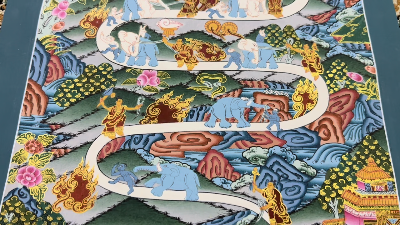 Namaste and Welcome to my Gallery!!! All of the paintings and arts in my gallery are originally handmade and hand-painted by my family members and other local artists who have been practicing their craft for over two decades. My father is Master Artists Nepal with an experience of more than four decades; you can see some of his work in this Gallery. Also you can see some of the beautiful and soulful artwork of talented local artists from Himalayas. ~~Way to Nirvana Thangka Painting~~ Way to Heaven Thangka Art is hand-painted on cotton canvas which illustrates the different stages of Samatha meditation, showing a monk chasing and finally capturing an elephant. Samatha or “Shamatha” means calm and with Vipassana is one of the fundamental meditation practices of the Tibetan Buddhist tradition. This Thangka painting illustrates the different stages of the Samatha meditation showing a monk chasing and finally capturing an elephant. The elephant, representing the mind, is led by a monkey representing the distractions. Gradually both the monkey and the elephant change color, metaphor of the ability of the practitioner through his effort to purify the lethargic tendencies of the mind. Even a rabbit turn and look at the monk to indicate that distractions acknowledge who is in charge. In the following stages, the monk starts leading the elephant. The monkey now follows the elephant rather than leading it and the rabbit disappears. Finally, the mind is under control and pacified. After also the monkey leaves the elephant and stands behind the monk saluting him with reverence. The last stages show the elephant resting aside the monk who sits at ease. Now the path has ended and a rainbow streams out of the monk’s heart. Perfect equanimity is found and the practitioner is ready to cross over into mental bliss. The monk rides the elephant along the rainbow path into the perfection of the transcendent realm and returns bearing the sword of Wisdom. The fires represent the struggle for control which reduces through familiarity. After, the final stage, bliss, and ecstasy are reached using the realization of the wisdom of emptiness to banish(drive away) ignorance. [Size = 44cm x 33cm] Material Used: • Cotton Canvas • Natural Pigments and colors • Gold leaf ~Excellent for meditation or home/office decor, ~Tibetan Yoga Wall Art ~Genuine 100% hand-painted from Himalayas Please feel free to contact me if you have any question regarding the painting.