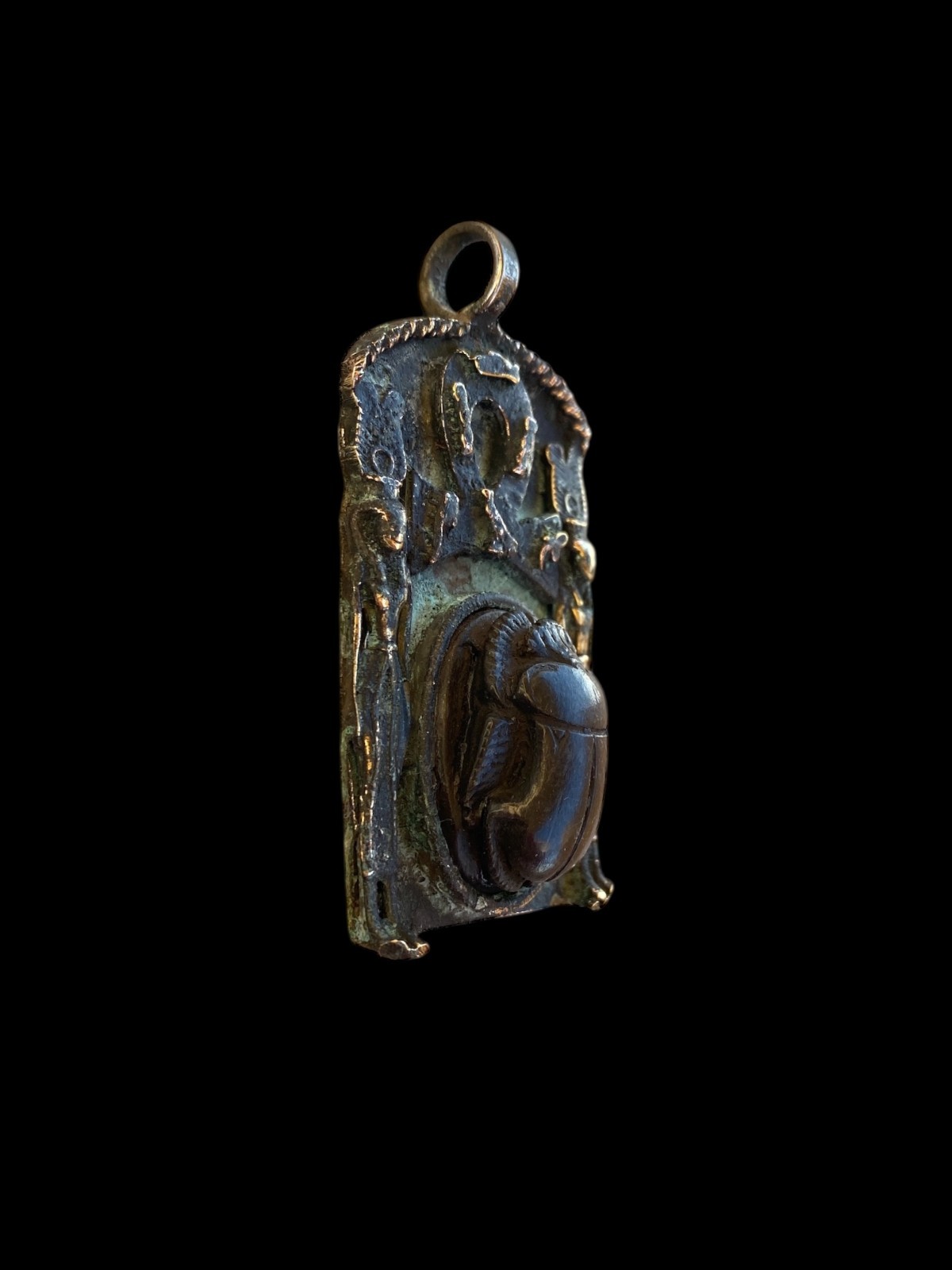 This handmade vintage pendant combines the Ankh Key and Scarab Beetle symbols, making it a unique and meaningful piece for various occasions like weddings, anniversaries, or birthdays. The pendant features a round shape with a spring ring closure, crafted from bronze with a gold color. It is personalized and engraved with Egyptian themes, such as beauty, nature, and luck. This antique jewelry is sourced from Egypt and is part of an Egyptian collection, making it a special addition to any jewelry collection.
