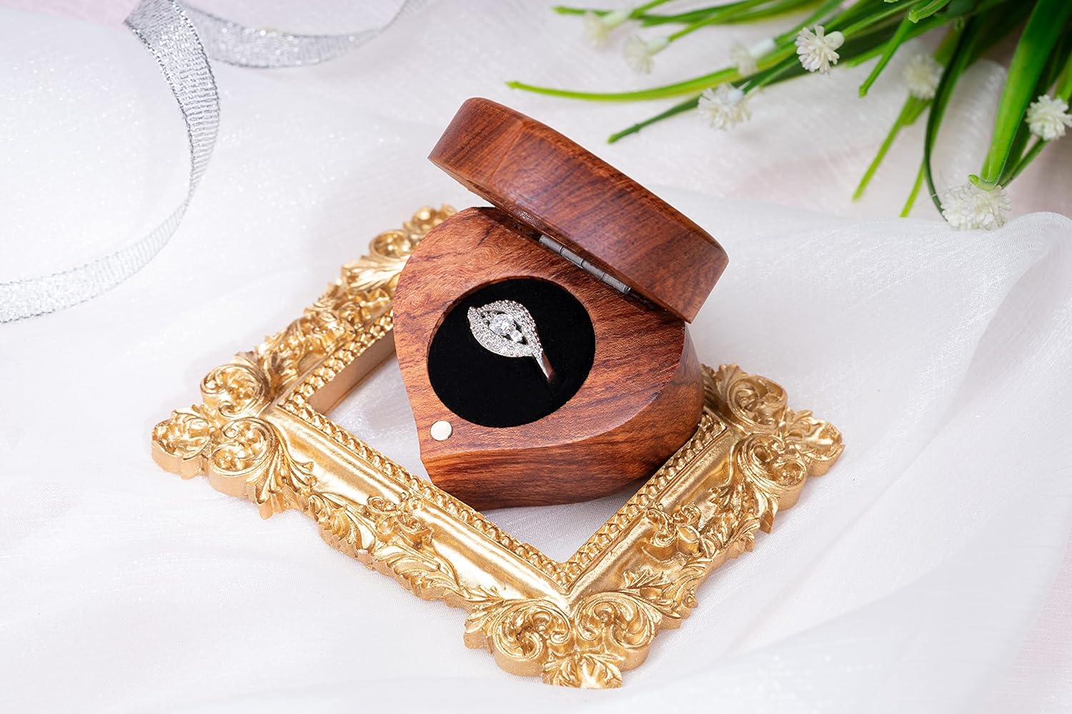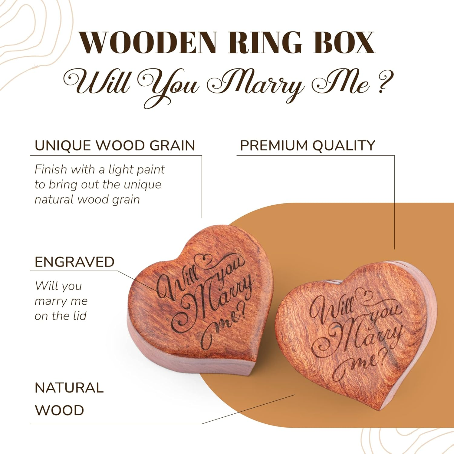 Ring Box Heart - Handmade Wooden Ring Box for Proposal, Ring Holder Box with Single Slot, Unique Heart Shape Engraved with Will You Marry Me? (Heart) ENJOY THE FEATURES ✅ ✨ Premium Natural Wood Craftsmanship – Made from high-quality walnut wood, this ring box exudes a classic, elegant, and durable finish, adding a touch of sophistication to any proposal or special moment. ✅ 💍 Compact and surprising design – Compact size makes it easy to hide, The sharp "Will you marry me?" engraved background is perfect for surprise proposals, anniversaries, and other meaningful occasions. ✅ 💍 Total Size: 1.5in * 1.5in / 3.8 * 3.8cm, Jewelry Storage Space: Ring Size1.07in / 2.6cm, Small Volume and Light Weight, Perfect for a Beautiful Engagement Ring ✅ 🔒 Secure Magnetic Closure – Designed with a strong magnetic mechanism, ensuring a smooth and effortless open-close experience while keeping the ring safe and secure. ✅ 🎁 Soft Velvet Lining for Maximum Protection – The luxurious velvet interior holds the ring firmly in place, preventing scratches or accidental drops. ✅ 💖 Perfect for Various Occasions – Ideal not only for proposals but also as a wedding ring box, anniversary gift, jewelry display case, or keepsake storage for treasured rings and accessories. Product Description FANTASY GIFT FOR YOUR LOVE HANDMADE CARVING Wood ring box for proposal is completely handmade by the skilled craftsmen. The cover is carefully finished with magnetic enclosure. The sponges ring insert insides was coved with smooth velvet, absolutely ensure the ring intact and can’t fall out. UNIQUE GRAIN 100% national color, we just applied a thin layer of paint to bring out the different wood grain. Each box is a unique version of itself, almost no two boxes are exactly alike. It is a unique highlight in the wedding ceremony, or a good movie in your memorable wedding photos. FANTASY GIFT FOR YOUR LOVE Rustic wood ring box is perfect gift for your proposal, specially, the dinner party, when travelling, walking in forest, beach, or campus of church. It is a lasting mementos placed on vintage shelve or in your bedroom as proof of your enduring love. WOOD RING BOX WILL YOU MARRY ME? The Will you mary me Ring Box is crafted from natural wood. Please note that lighting conditions in photos may cause slight variations in color from the actual product Item model number U7-Z8I9-VOVC Style Heart Number of Items 1 Closure Type Drawstring Country of Origin Vietnam Batteries Included? No Jewelry Storage Type Ring Cone Batteries Required? No Number of Compartments 1 Special Feature Lightweight Product Dimensions 1.96"D x 2.05"W x 1.52"H Material Wood Finish Type Polished Item Package Quantity 1 Item Weight 0.32 ounces Finish Polished Occasion Valentine's Day Special Features Lightweight Target Audience Men Part Number U7-Z8I9-VOVC Mounting Type Table Top Color Double ring box Inner Material Velvet & soft sponge Shape Heart Recommended Uses For Product Ring Number Of Pieces 1 2.05 "h x 1.96 "h x 1.52 "h. Weight: 0.32 oz PAYMENT We accept all payments via Ebay using Credit Cards , PAYPAL , Apple Pay and many others SHIPPING We are always working hard to ensure your package arrives as soon as possible. Please understand that some factors like weather, high postal traffic, and the performance of shipping companies are outside of our control. We offer free shipping to the lower 48 states and ship within 2 business days of payment, usually sooner. We do not accept P.O. Boxes. Please provide a physical address. DELIVERY & RETURN POLICY We offer a 30-Day Return Policy on items in which you are not completely satisfied with. You have the option of a full-refund or an exchange of the item. No returns are available on items shipped outside of the USA. Your feedback very important to us, after you get your package and you are satisfied with our service please leave us positive feedback If you have any problem with your order / any questions please before leave any type of feedback