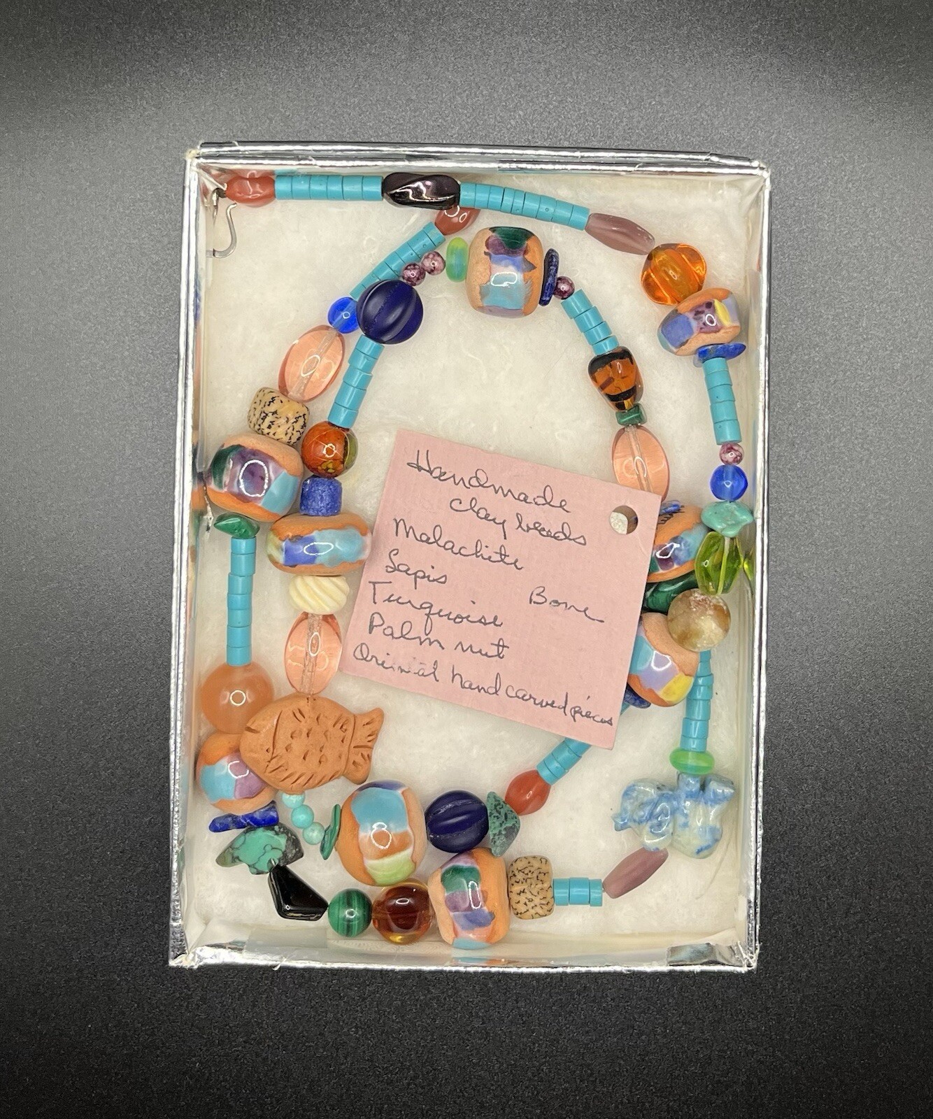Fun vintage necklace with handmade clay beads plus repurposed/found beads made of various materials including glass, bone, palm nut, as well as natural and manmade stones. Includes original box and tag. A fun piece for any whimsical collection!