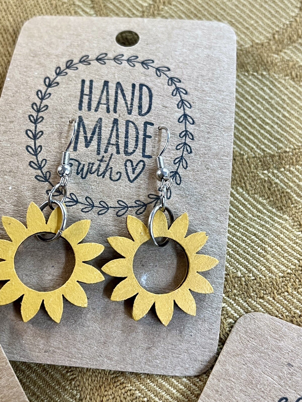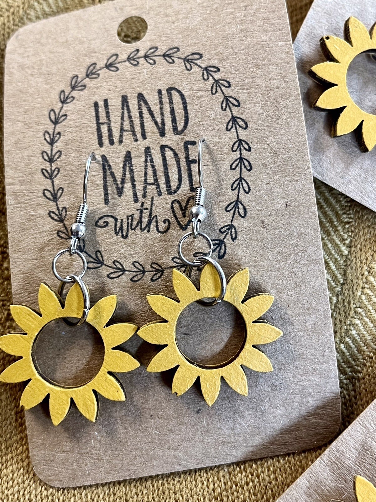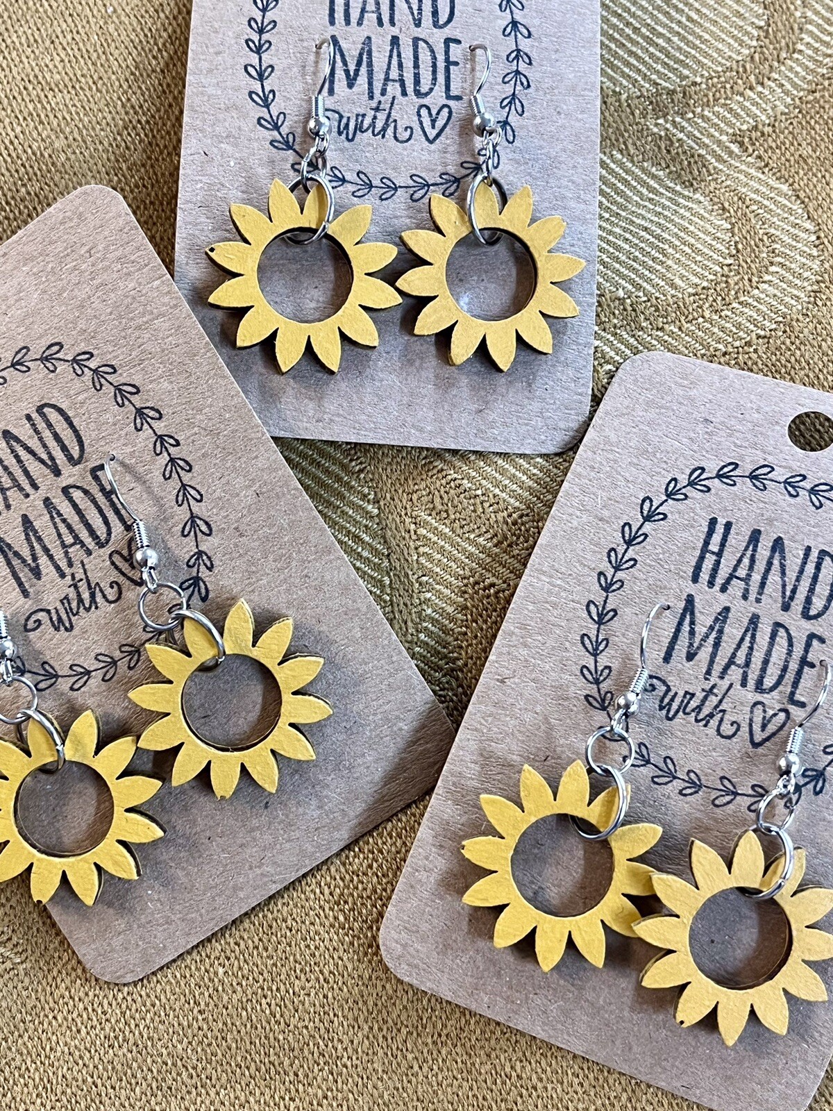 These Round Sunflower Earrings by On The Go Studio are hand-painted yellow dangle earrings made of wood. The sunflower shape and design make them a beautiful addition to any outfit, with a nickel-free closure for sensitive ears. Made in the United States, these earrings are both stylish and unique, perfect for those who love floral-themed accessories. . One petal has a slight defect on each pair, but it is not very noticeable. . 1.75” in length!
