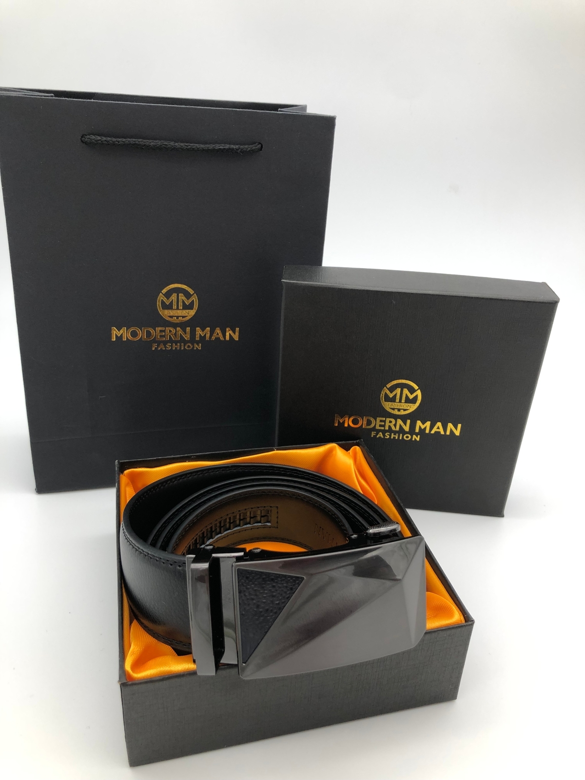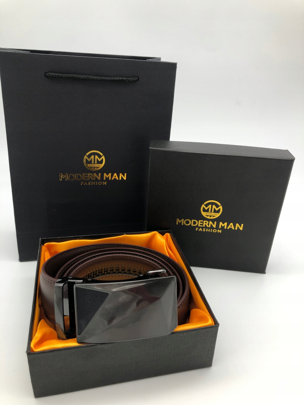 THE MODERN MEN'S BELT IS A MEN'S ACCESSORY WITH CHARACTER!!! A leather belt is one of those pieces of clothing that simply cannot be missing in a man's wardrobe!! Men's belts complete the styling and complete it. The MODERN MEN men's belts we offer are the highest quality haberdashery that look great and emphasize the character of each creation. The buckles made in a very modern style also deserve special attention. WHY THIS BELT? ✅ Unpretentious style - the classic trouser belt reinterpreted ✅ Natural Skin ✅ Elegant Polished Buckle ✅ Complete with box - ready for a gift ✅ Strong and Durable - Band for Years ✅ FREE Gift Bag ✅ Great price ✅ Easy shortening ✅ It works in almost any stylization - every day, on the go, at work, at university, for larger trips NATURAL SKIN Do you value quality? The natural leather from which the band is made is a fashionable and durable material that will serve you for a long time. The MODERN MEN belt perfectly underlines the character of the outfit and makes every man look fashionable and stylish. Highest quality workmanship allows our belts to meet the expectations of even the most demanding h clientów. AUTOMATIC ATTACHMENT MODERN MAN belts have automatic buckles with a special belt fastening mechanism. Your great advantage is the individual adjustment of the strap length by shortening the buckle. The comfortable adjustment allows us to quickly and easily buckle the strap on and off. SHORT IT YOURSELF The big advantage is the ability to quickly shorten the strap to the desired size! Detach the buckle from the strap, then cut the leather strap to the desired length. Finally, close the belt buckle again. This should take a few seconds! PARAMETERS ✅ Brand: MODERN MAN ✅ Belt Length Without Buckle: 120cm ✅ Waist: 110cm ✅ Belt Width: 3.5cm ✅ Material: Natural Leather ✅ Colour: Black, Brown ✅ Clasp: Metal engraved by MODERN MAN ✅ Packing: Company Carton + FREE BAG