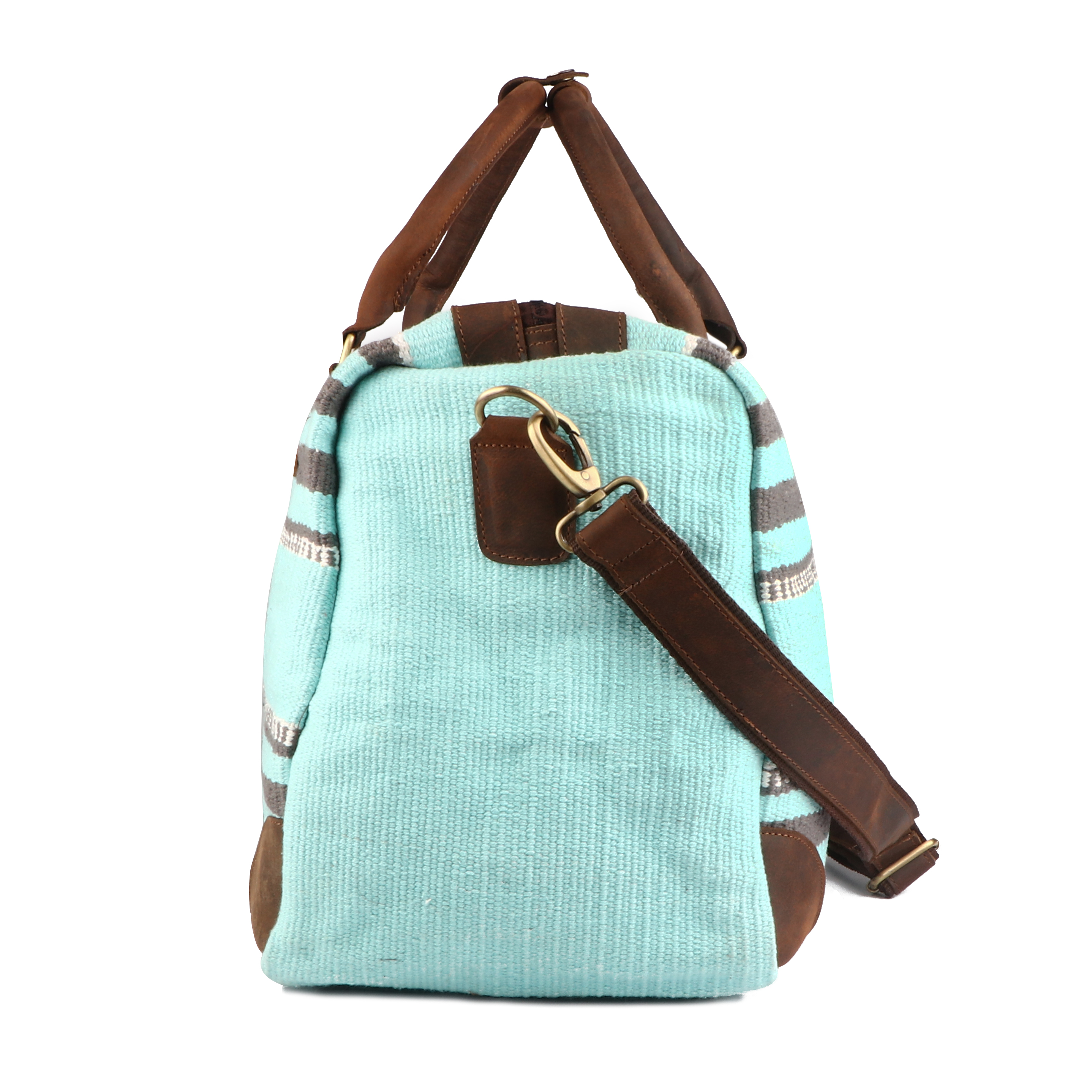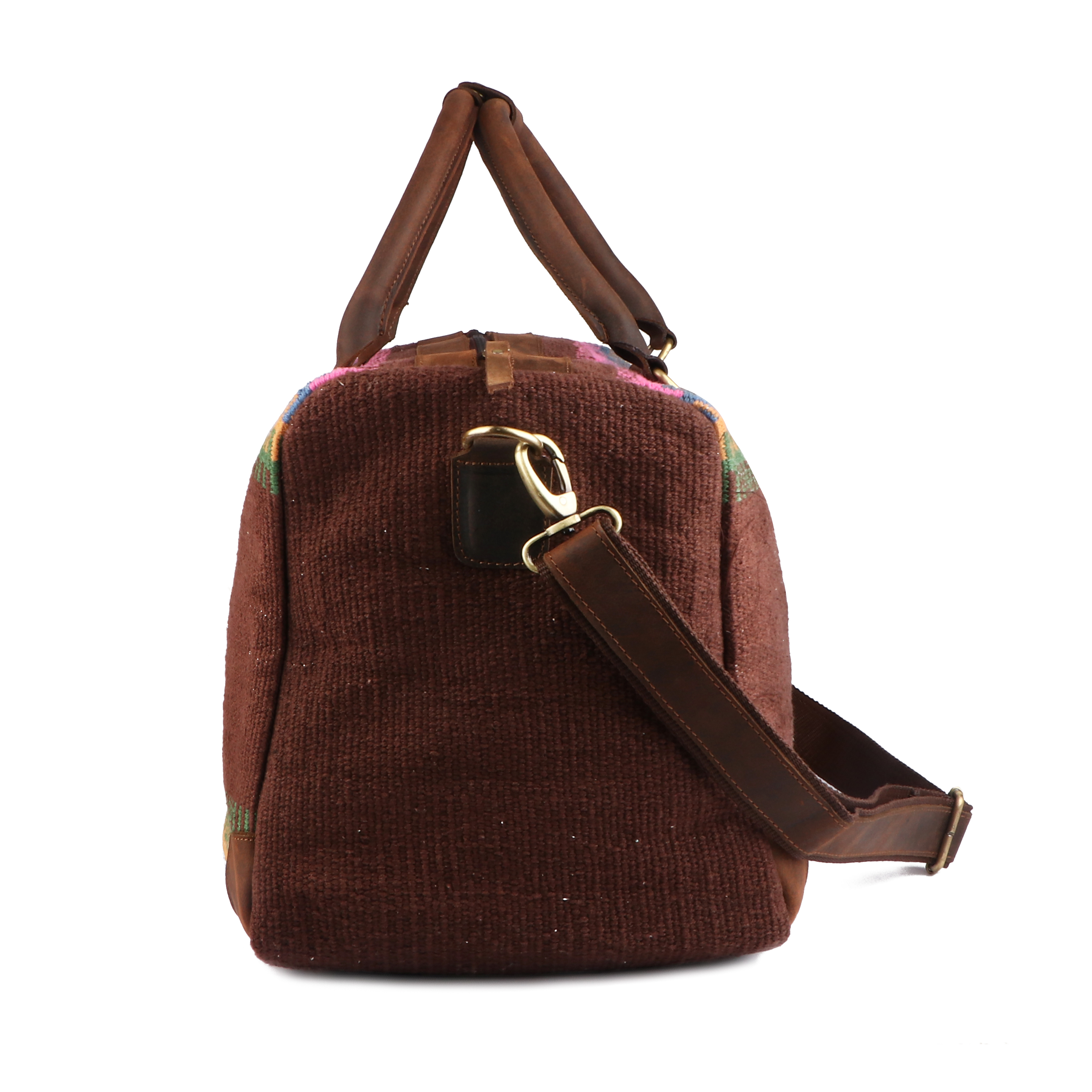Description Tack Market. Top Brand and Quality products at rock bottom prices. Challenger duffle bag made from handwoven wool, and genuine full-grain leather to endure everyday use. This bag features a multicolor Aztec print, and brown distressed leather accents. Perfect choice for travel, and weekend trips. Conveniently sized roomy bag fits most airline overhead bins. Includes a removable shoulder strap. Main compartment has a full zipper closure with a wide opening to easily access your belongings. The fully lined interior also features a side zippered pocket, and two open pockets for additional storage. The antique finish brass hardware beautifully ties the bag together. Bag measures 16" L x 10" W x 12" H providing plenty of room for all of your essentials. Shipping Items will be shipped within 24 hours of payment received during business days. We observe major US holidays. We use United State Postal Service and UPS Ground as our shipping carrier. Free shipping is only within US with exception of Alaska, Hawaii, PR. We do offer expedited shipping. We ship worldwide. We prefer shipping with UPS for Canada. Physical address is required for large items such as saddle, blankets, saddle bags. We do offer shipping discount for multiple items. Please do not pay each item separately if you want to get combine shipping rate. Combined shipping rate for multiple items in auction format $5.00 off on each additional Item. Payment We accept PayPal payment or major credit cards. Payment must be received within 5 days after auction ends. Texas residents pay 8.25% sales tax. Returns We're happy to exchange your item or refund your money If you are not completely satisfied, you may return your unused item within 30 days from your date of purchase for refund. Return shipping is at the customer's expense. 20% restocking fee will be deducted from original cost. Refund will be madeupon receipt of the item. Shipping cost for an exchange of size or an item less than 20lbs is $15. Send return item with a copy of packing slip.